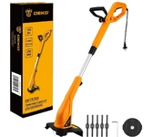 Триммер садовый электрический DEKO DKTR700 - компактная модель, удобная для скашивания травы в труднодоступных местах, вдоль заборов, клумб, подравнивания газонов, краев садовых дорожек. Удобное расположение отсекателя режущей лески на защитном кожухе обеспечивает комфорт в процессе работы. Технические характеристики: Напряжение: 230 В Частота: 50 Гц Мощность: 700 Вт Число оборотов: 12000 об/мин Диаметр резки: 250 мм Сечение лески: 1.2 мм Головка катушки: полуавтоматическая Телескопическая штанга: да В комплекте: Триммер (верхняя и нижняя части) - 1 шт Защитный кожух - 1 шт Пластиковые ножи - 5 шт Катушка (установлена) - 1 шт Шестигранный ключ - 1 шт Крепежный комплект (винт - 2 шт, саморез - 1 шт, гайка - 1 шт, шайба - 1 шт) - 1 шт Руководство по эксплуатации - 1 шт