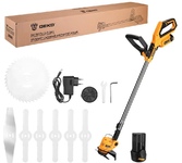 Технические характеристики: Тип аккумулятора: Li-Ion Число оборотов: 11000 об/мин Диаметр резки: 150 мм Тип двигателя: щеточный Емкость АКБ: 2,0 Ач Напряжение АКБ: 12 В Триммер поставляется в частично собранном виде: Триммер - 1 шт Защитный кожух - 1 шт В комплекте: Полуавтоматическая катушка с леской - 1 шт АКБ - 2 шт Зарядное устройство - 1 шт Режущий диск - 1 шт Металлический нож - 1 шт Пластиковые ножи - 5 шт Триммерная головка - 1 шт Шестигранный ключ - 1 шт Гаечный ключ - 1 шт Скоба - 1 шт Крепежный набор (винт - 1 шт, шайба - 1 шт, гайка - 2 шт) - 1 шт Руководство по эксплуатации - 1 шт