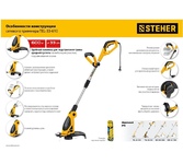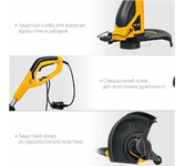 Тип двигателя: электрический. Расположение двигателя: нижнее. Форма штанги: прямая. Мощность двигателя (Вт): 300. Тип электропитания: от электросети. Режущий элемент: леска. Диаметр круга стрижки: 23. Диаметр используемой лески: 1.5. Тип крепления триммера: отсутствует. Вес товара: 1.56. Комплект поставки: Триммер.. Особенности: Надежный коллекторный двигатель. Дополнительная рукоятка для работы двумя руками. Скашивание с помощью лески. Автоматическая подача лески. Корпус из ударопрочного пластика. Приспособление для разгрузки кабеля от натяжения.. Обороты двигателя: 11000. Тип косильной катушки: автоматическая. Форма рукоятки: D-образная. Тип штанги: неразборная штанга. Уровень шума: 76. Габариты упаковки (ед) ДхШхВ: 0.184x0.124x0.598. Вес упаковки (ед): 1.6. Гарантия: 12 мес.. Режущая система: леска. Двигатель: электрический, расположение нижнее. Тип электропитания: от электросети. Вес: 1.56 кг