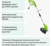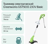 Тип двигателя: электрический. Расположение двигателя: нижнее. Форма штанги: прямая. Мощность двигателя (Вт): 500. Тип электропитания: от электросети. Режущий элемент: леска. Диаметр круга стрижки: 33. Диаметр используемой лески: 1.6. Тип крепления триммера: отсутствует. Регулировка длины штанги: есть. Вес товара: 2.77. Комплект поставки: Триммер электрический 500W Basic GREENWORKS GST5033, руководство по эксплуатации, упаковка.. Обороты двигателя: 13000. Тип косильной катушки: автоматическая. Форма рукоятки: D-образная. Защитная скоба: есть. Тип штанги: неразборная штанга. Уровень шума: 96. Габариты упаковки (ед) ДхШхВ: 1.02x0.25x0.113. Вес упаковки (ед): 2.4. Страна производства: Китай. Гарантия: 12 мес.. Тип электропитания: от электросети. Вес: 2.77 кг. Двигатель: электрический, расположение нижнее. Режущая система: леска. Регулировка: длины штанги