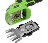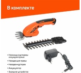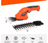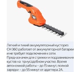 Частота ходов: 1100. Длина основного ножа для кустов: 160. Ширина ножа для травы: 80. Тип электропитания: от аккумулятора. Емкость аккумулятора: 1.5. Напряжение аккумулятора: 7.2. Тип аккумулятора: Li-Ion. Продолжительность работы от аккумулятора: 20. Время зарядки, около: 120. Индикатор заряда батареи: есть. Антиблокировочная система: нет. Защитное устройство ножа: нет. Защитный тормоз: нет. Ножи с алмазной заточкой: нет. Смена ножей без инструмента: есть. Комплект ножниц для травы и кустов: есть. Длина инструмента: 324. Высота инструмента: 125. Вес товара: 0.99. Комплект поставки: Ножницы садовые, кабель для зарядки Type-C, АКБ (встроен), сменные насадки (1 насадка установлена) – 2 шт., руководство по эксплуатации.. Аккумулятор в комплекте: есть. Зарядное устройство в комплекте: есть. Габариты упаковки (ед) ДхШхВ: 0.33x0.11x0.13. Вес упаковки (ед): 1.37. Страна производства: Китай. Гарантия: 12 мес.. Аккумулятор: Li-Ion, 7.2 В; 1.5 Ач. Частота ходов: 1100 ход/мин. Электропитание: от аккумулятора. Длина осно