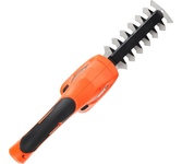 Аккумуляторный кусторез предназначен для снятия проросшей сквозь плиточные швы травы, правится с побегами крыжовника, малины, хвойниками. После установки опорных колес подравняет газон вдоль дорожек и заборов, подстрижет поросль у деревьев и клумб. Справится с ветками диаметром до 8 мм. В комплекте две насадки — для травы и для кустарников. Ширина насадки для травы — 100 мм, длина ножа для кустарников — 200 мм. Не скользят в руке, благодаря прорезиненной рукоятке. Поставляется без аккумулятора и зарядного устройства.