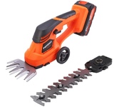 Частота ходов: 1250. Длина основного ножа для кустов: 200. Ширина ножа для травы: 100. Расстояние между ножами: 8. Тип электропитания: от аккумулятора. Емкость аккумулятора: 2. Напряжение аккумулятора: 21. Тип аккумулятора: Li-Ion. Продолжительность работы от аккумулятора: 30. Время зарядки, около: 120. Индикатор заряда батареи: есть. Антиблокировочная система: есть. Защитное устройство ножа: нет. Защитный тормоз: нет. Ножи с алмазной заточкой: нет. Смена ножей без инструмента: есть. Комплект ножниц для травы и кустов: есть. Длина инструмента: 345. Высота инструмента: 125. Вес товара: 0.63. Комплект поставки: Ножницы-кусторез аккумуляторные; насадка для травы; насадка-кусторез; опорные колёса; аккумуляторная батарея; зарядное устройство; инструкция.. Аккумулятор в комплекте: есть. Зарядное устройство в комплекте: есть. Габариты упаковки (ед) ДхШхВ: 0.345x0.125x0.15. Вес упаковки (ед): 1.92. Страна производства: Китай. Гарантия: 24 мес.. Длина основного ножа для кустов: 200 мм. Электропитание: от аккумулятора.