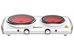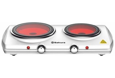Плитка настольная с инфракрасным нагревом, 2 стеклокерамических конфорки, мощность 1200Вт / 900Вт, диаметр конфорок 16.5см / 14см, размер прибора - 475*275*83мм, максимальная температура нагрева 530-570С, максимальная нагрузка на плиту 16кг (по 8кг на конфорку), механическое управление, световой индикатор, шнур 0,8 м, цвет белый