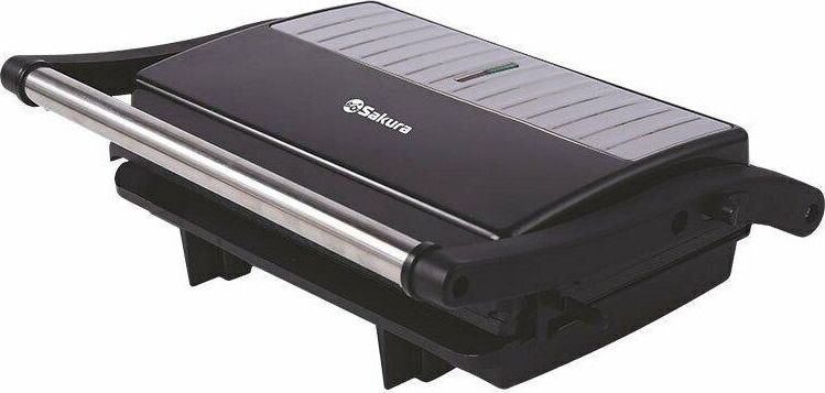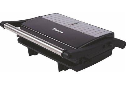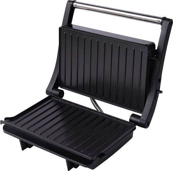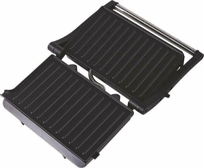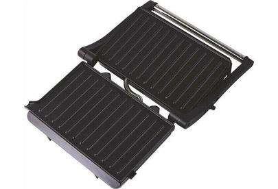 Гриль электрический, мощность 1000Вт, 2 рифленые панели для жарки, размер панели 23.1х14.6 см, антипригарное покрытие, открытие панелей на 180° (возможность приготовления на 2 пластинах одновременно), индикатор работы, прорезиненные ножки. Корпус из нержавеющей стали и термостойкого пластика.