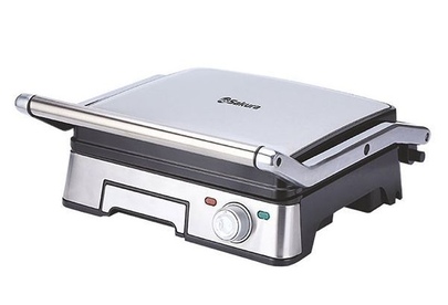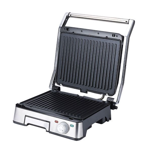 1800 Вт, жаропрочное антипригарное покрытие, регулируемый термостат (160-240°C), открытие панелей на 180°, съемные панели 290*230 мм, световой индикатор работы/нагрева, контейнер для сбора масла, защита от перегрева, горизонтальное хранение и транспортиро