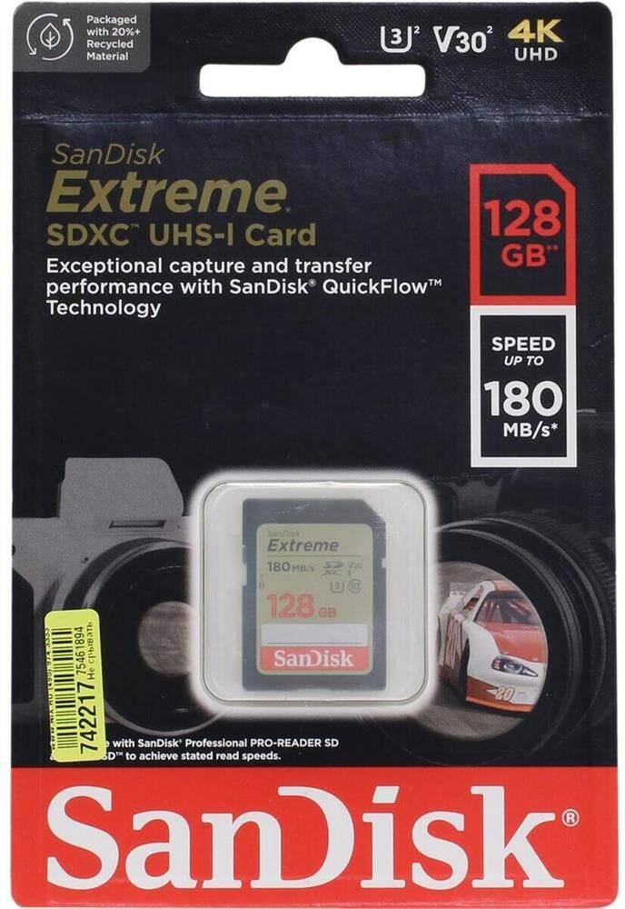 SANDISK Карта памяти Extreme SD UHS I 128GB Card for 4K Video for DSLR and Mirrorless Cameras 180MB/