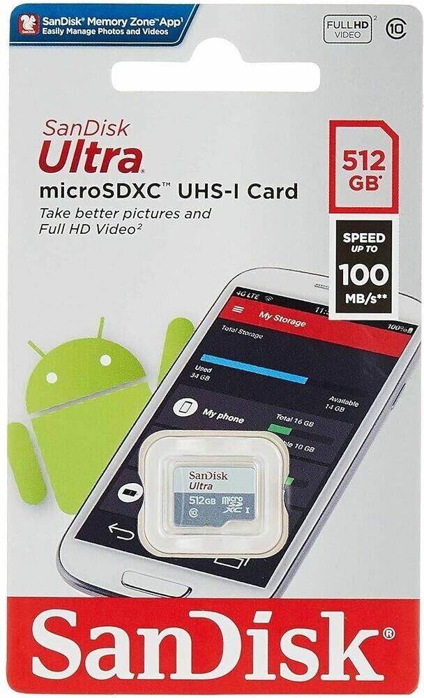 SANDISK Карта памяти microSDXC UHS-I U1 Ultra 512 ГБ, 100 МБ/с, Class 10, SDSQUNR-512G-GN3MN, 1 шт.,