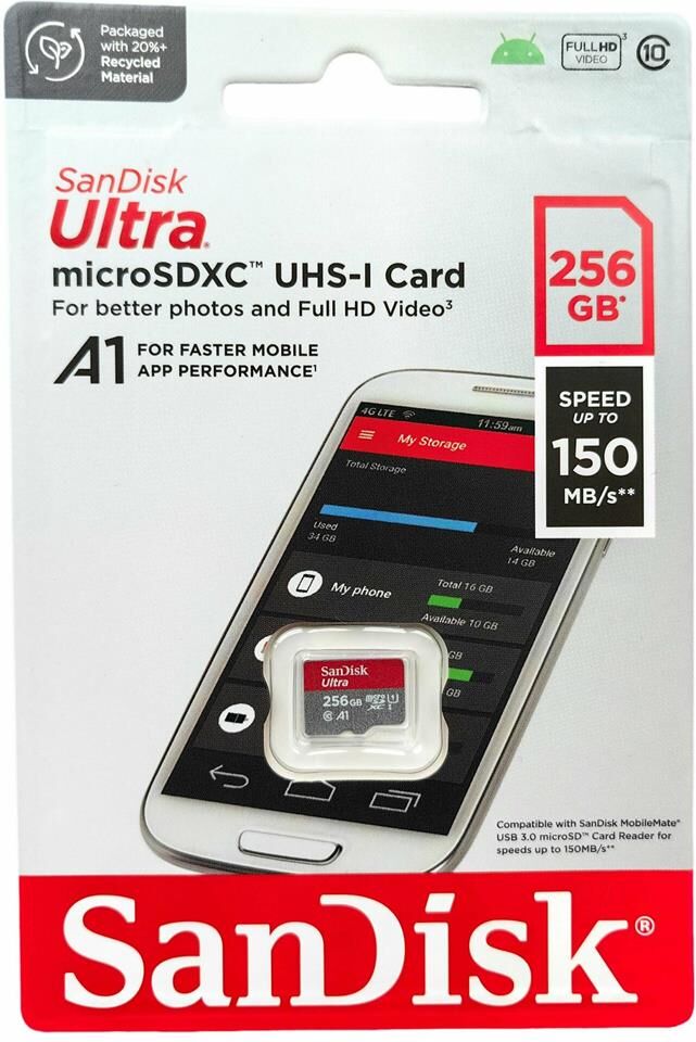 Карта памяти SanDisk Ultra, UHS-I U1, Class 10, A1, microSDXC, 256 ГБ (SDSQUAC-256G-GN6MN) Флеш-карты серии SanDisk Ultra полностью отвечают новым спецификациям Ultra High Speed Class 1. Они поддерживают высокоскоростную непрерывную фотосъемку и видеозапись формата Full HD, позволяя не пропустить ни одного восхитительного момента. Карты полностью соответствуют спецификациям Ассоциации SD и отличаются надежностью, долгим сроком службы, совместимостью со множеством мобильных цифровых устройств, поддерживающих