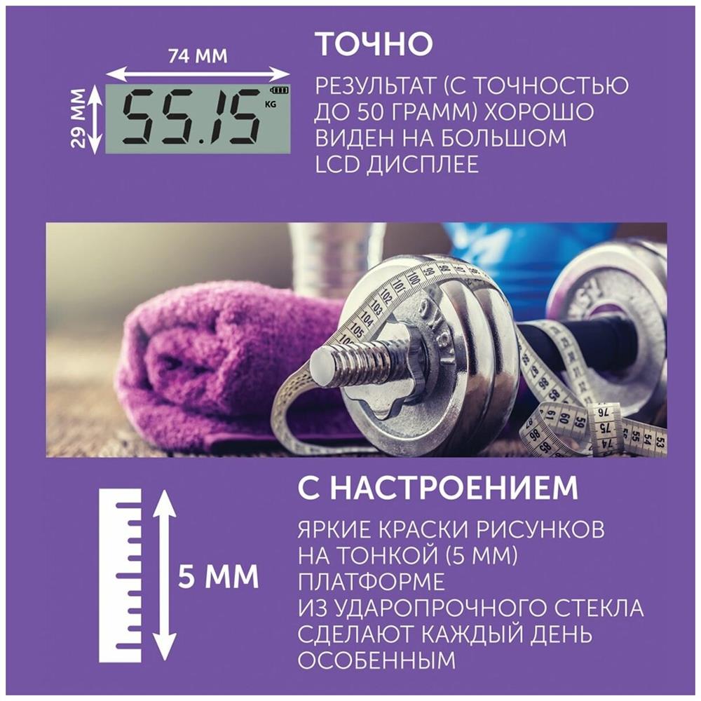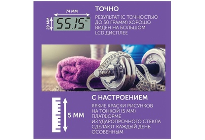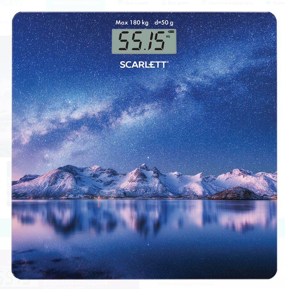 Весы напольные Высокочувствительные датчики Максимальный вес: 180 кг Высокопрочная платформа из закаленного стекла толщиной всего 5 мм Автоматическое включение/выключение Индикатор перегрузки Индикатор батарейки Цена деления: 50 г Большой жидкокристаллический дисплей 73 x 29 мм Прорезиненные ножки для дополнительной устойчивости и предотвращения скольжения Питание: 1 батарейка 3 V CR2032 (включена в комплект) Цвет: звездное небо