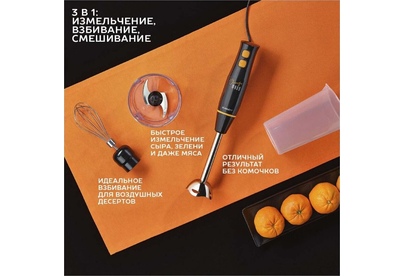 Тип: Погружной Мощность, Вт: 900 Количество скоростных режимов: 2 Режим TURBO: Да Мини-измельчитель: Да Емкость мини-измельчителя, л: 0.5 Венчик для взбивания: Да Мерный стакан: Да Мерный стакан, л: 0.7 Насадка-блендер: Да Материал погружной части насадки-блендера: Нержавеющая сталь STEEL PRO Скорость работы, об/мин: 15000 Производительность*, кг/мин *рубленное мясо в насадке мини-измельчителе : 0.3 Мойка в посудомоечной машине: Венчик (металлическая часть),нож мини-измельчителя, мини-измельчитель без крышки Аксессуары в комплекте: Мерный стакан Материал корпуса: Пластик Длина электрошнура, м: 1 Цвет: Черный
