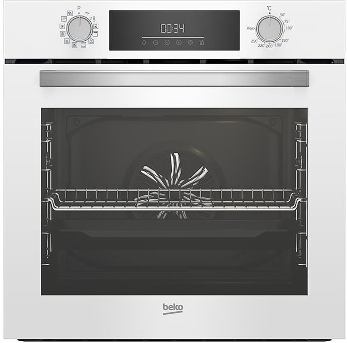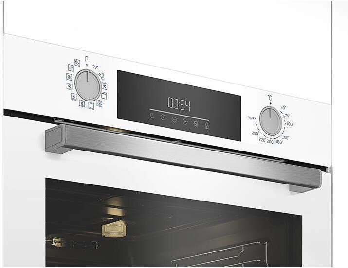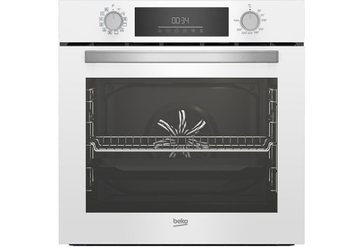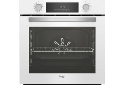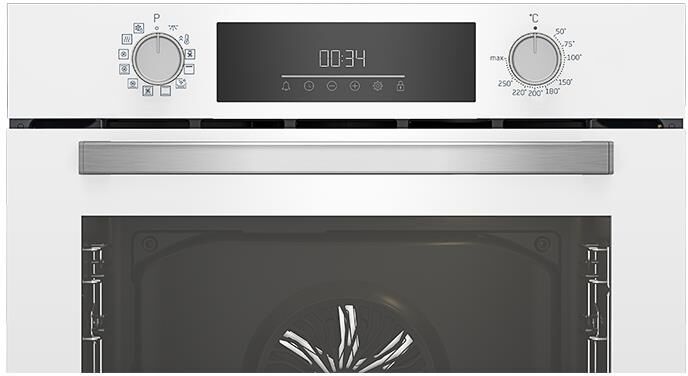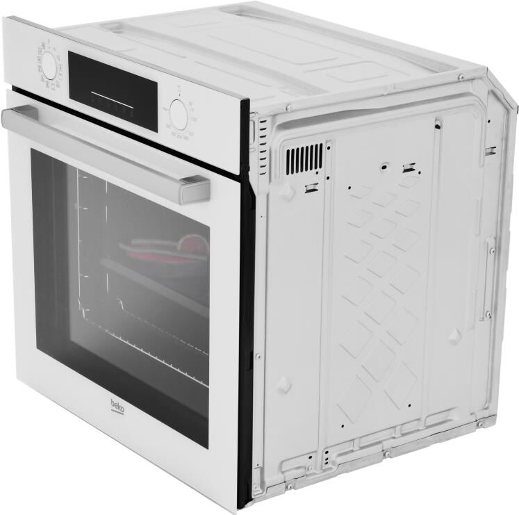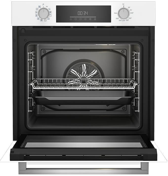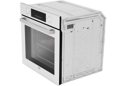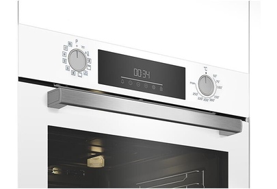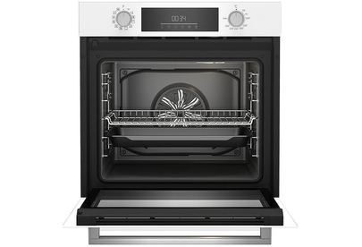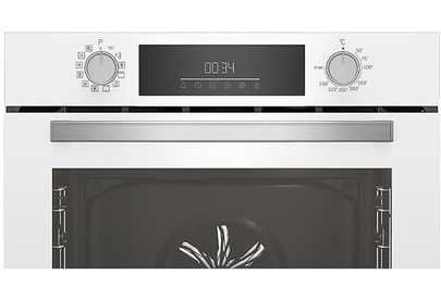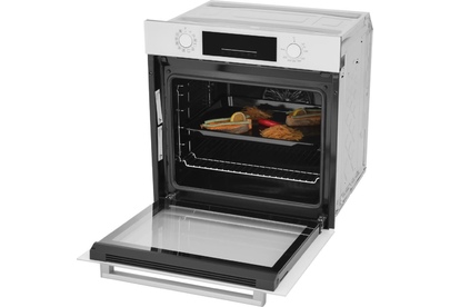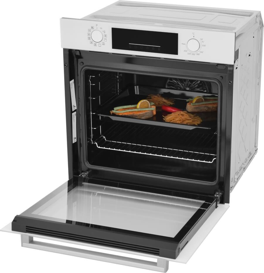 Размеры без упаковки (ВхШхГ), см - 59,5x59,4x56,7. Электрический духовой шкаф; 12 режимов; LED дисплей; утапливаемые поворотные переключатели; система очистки паром; металлические направляющие; объем - 72л; 2 стекла дверцы; 1 решетка; 1 противень; Цвет: Белый; Материал панели управления: Стекло