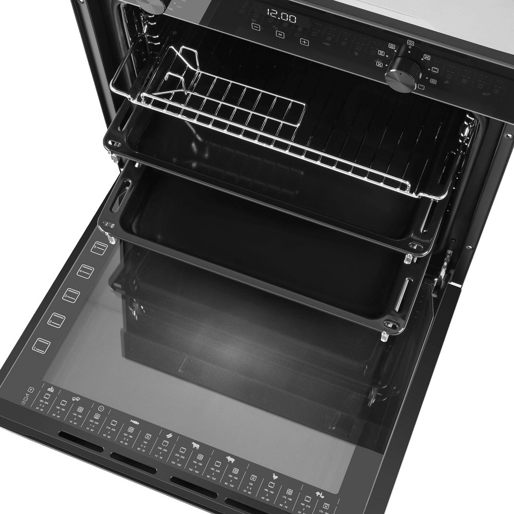 Электрический духовой шкаф Maunfeld ЕОЕМ.769В3 – модель черного цвета, которая хорошо вписывается в интерьер современной кухни. В его 76-ти литровой камере Вы сможете приготовить завтрак, обед, ужин, а также угощение для множества родственников или большой дружеской компании. Шкаф сочетается с современными технологиями, в том числе уменьшающими расход электричества – энергопотребление устройства соответствует классу А. На двух уровнях расположены выдвижные телескопические направляющие. Благодаря им Вам будет особенно легко ставить тяжелые противни в духовку, а затем доставать их. Горячий воздух остается внутри за счет плотно закрывающейся дверцы с тройным стеклом. Товар оборудован тангенциальной системой охлаждения. Такая система благодаря мощному вентилятору создает вокруг духовки воздушный барьер. Движущийся в нем воздух препятствует утечке тепла и позволяет защитить от перегрева как поверхность духового шкафа, так и кухонную мебель, в которую он установлен. С помощью