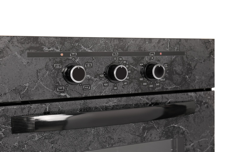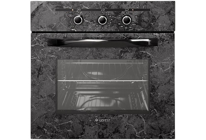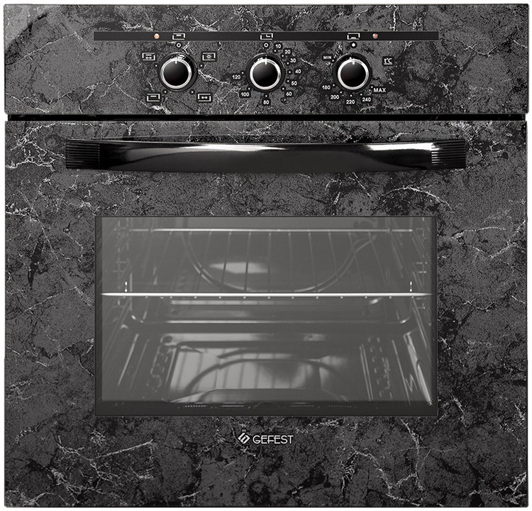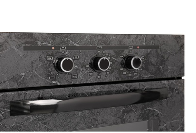 Газоэлектрический духовой шкаф со стеклянным фасадом, исполнение в чернов цвете под мрамор. Нижний газовый нагрев дополнен электрическим грилем и вертелом. Газовая горелка оснащена газ-контролем, электроподжиг интегрирован в поворотную ручку. Газовый нагрев - термостатированный, работает в диапазоне температур 170-240 градусов. На панель управления выведена индикация включения нагрева, в центре расположен механический таймер, с его помощью удобно прогнозировать ожидаемое время приготовления, звуковой сигнал пригласит проверить степень готовности блюда.