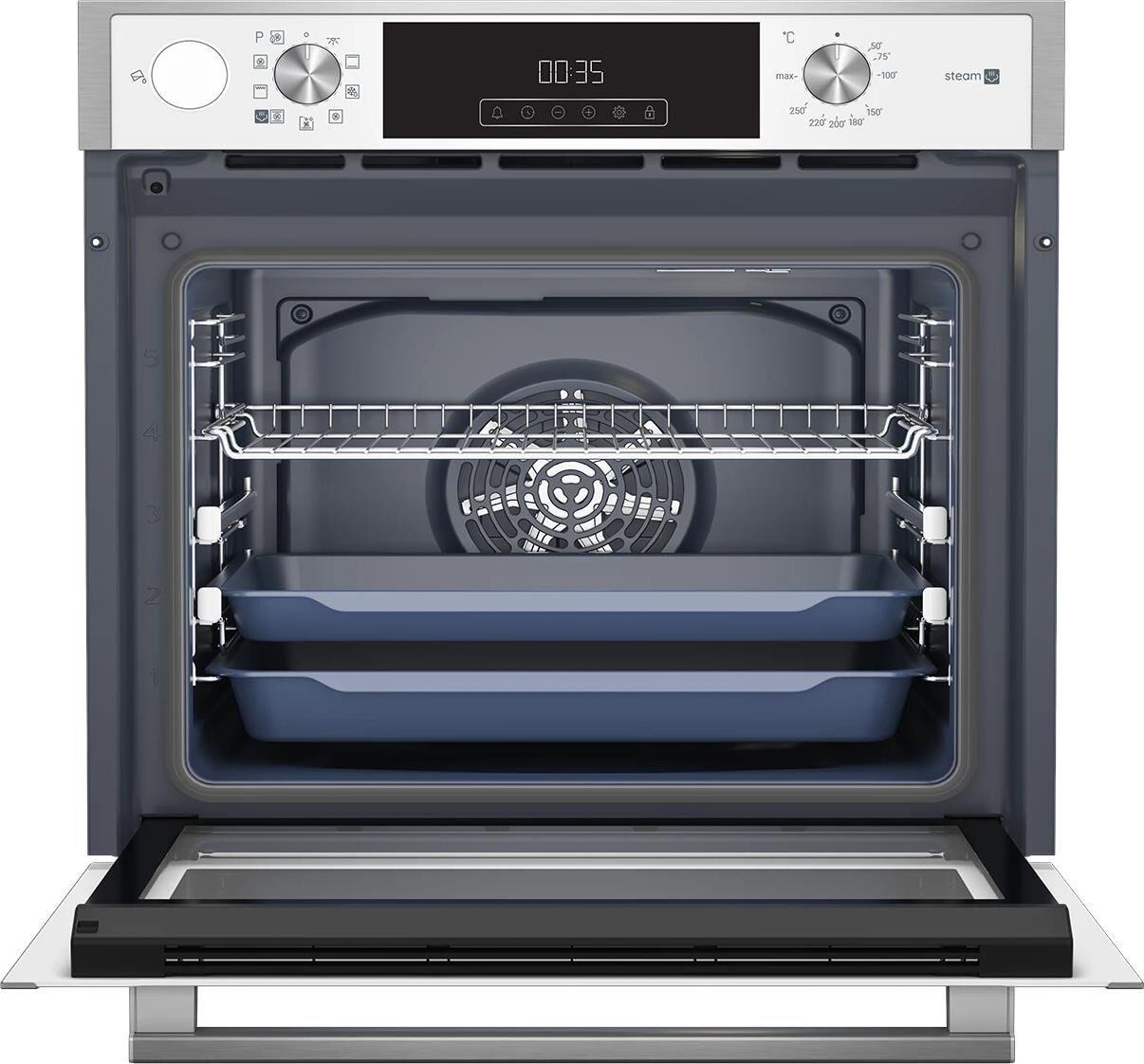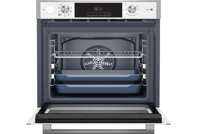 Электрический духовой шкаф; 9 программ; резервуар для приготовления с паром; дисплей; утапливаемые поворотные переключатели; плавное закрытие и открытие дверцы; система очистки паром; телескопические направляющие на двух уровнях; объем - 72л.; 3 стекла дверцы; 1 решетка; 1 противень; 1 глубокий противень; цвет - нержавеющая сталь