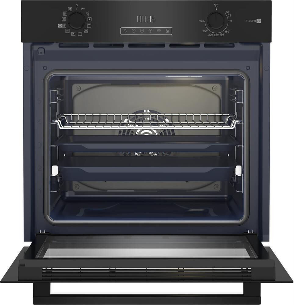 Электрический духовой шкаф; 12 режимов; AirFry; Приготовление с паром; дисплей; панель управления из стекла; утапливаемые поворотные переключатели; каталитическая очистка задней стенки; плавное закрытие дверцы; телескопические направляющие на одном уровне; объем - 72л.; 3 стекла дверцы; 1 противень; 1 глубокий противень; 1 аксессуар для AirFry; цвет - черный