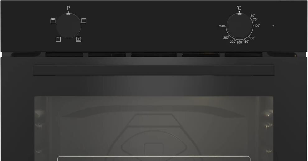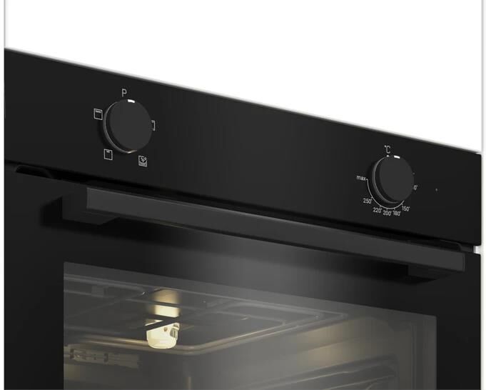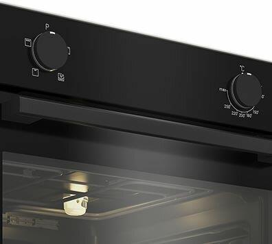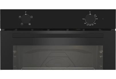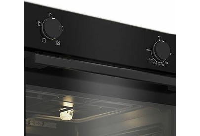 Электрический духовой шкаф; 4 программы; поворотные переключатели; рельефные направляющие; объем - 72л.; 2 стекла дверцы; 1 решетка; 1 противень; цвет - черный