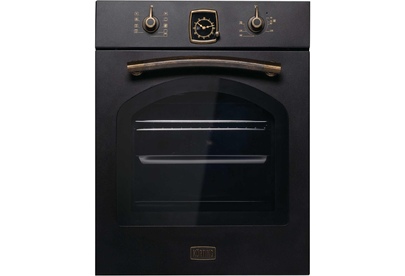 Духовой шкаф в ретро-дизайне, ширина 45 см, аналоговые часы в классическом стиле Frank Muller, таймера с функцией отключения, 9 режимов нагрева, объем духовки 45 л, телескопические направляющие на одном уровне, двухслойное остекление, каталитическая самоочистка, автоматическое отключение, в комплекте: 2 противня, хромированная решетка, цвет - черный; цвет ручек - бронза