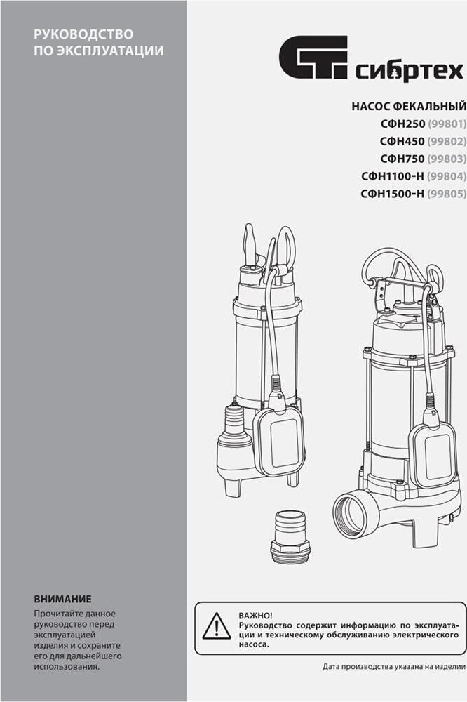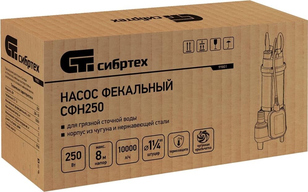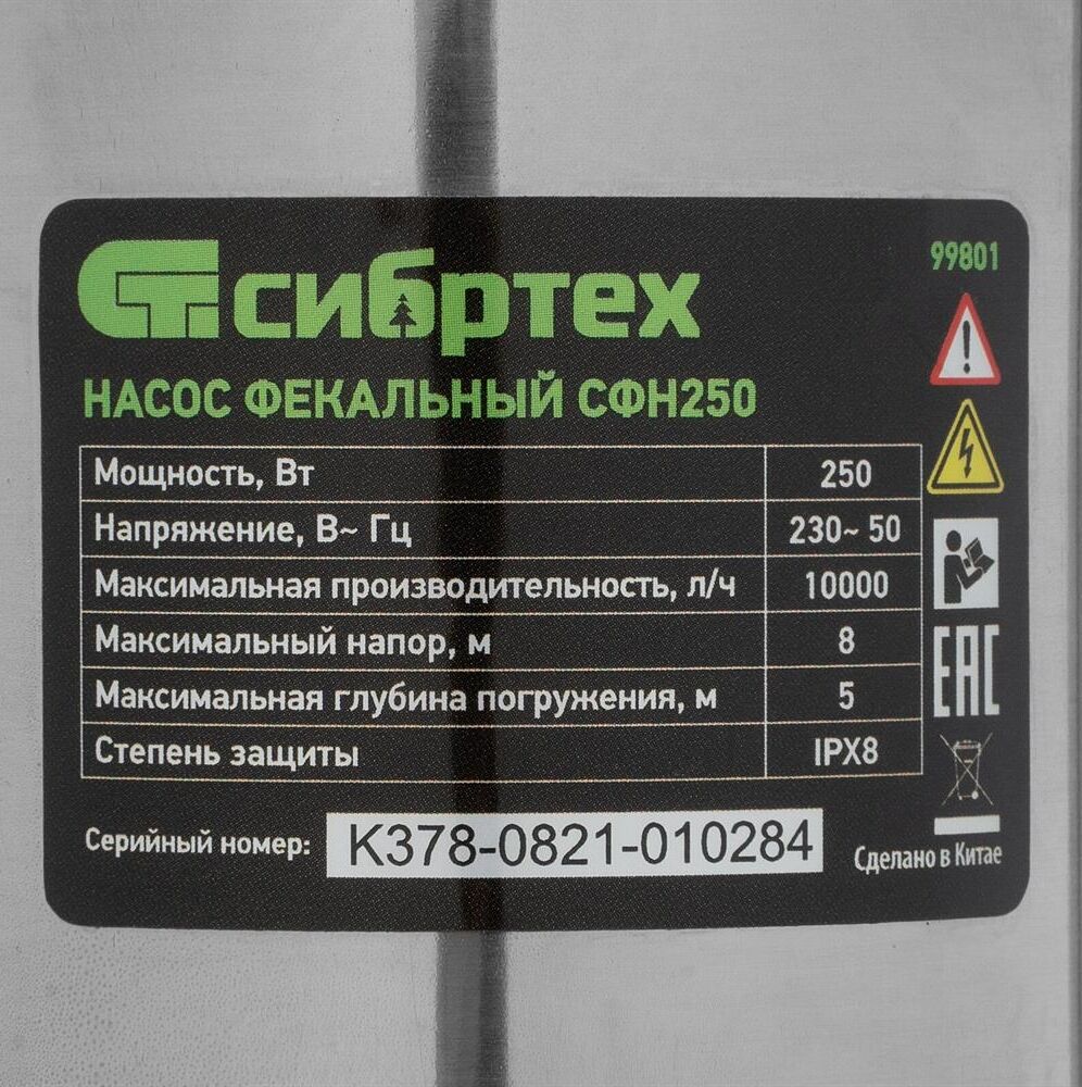 СИБРТЕХ Фекальный насос СФН250, 250 Вт, напор 8 м, 10000 л/ч 99801