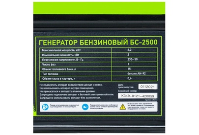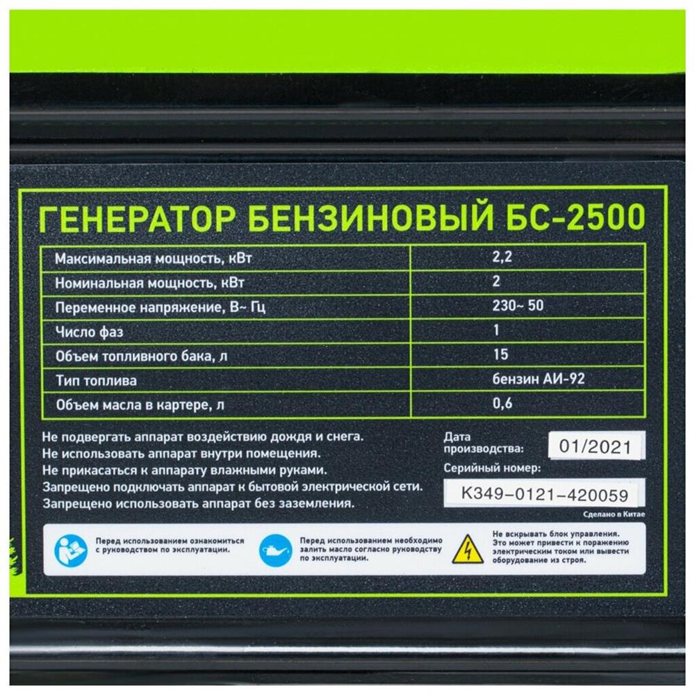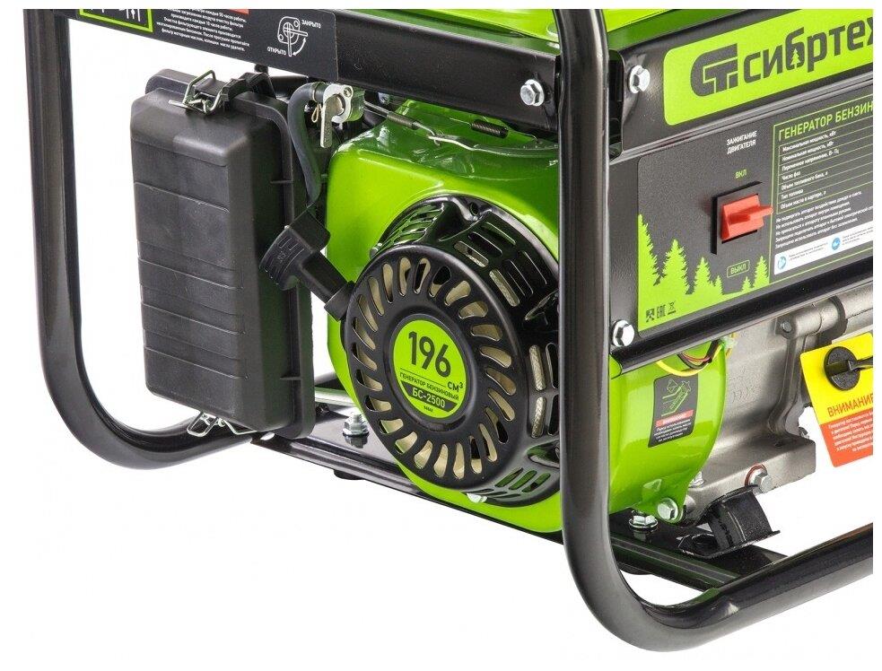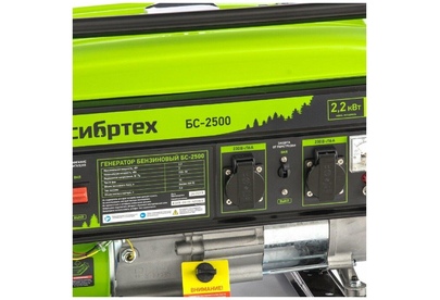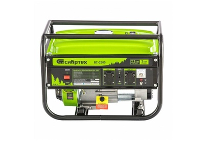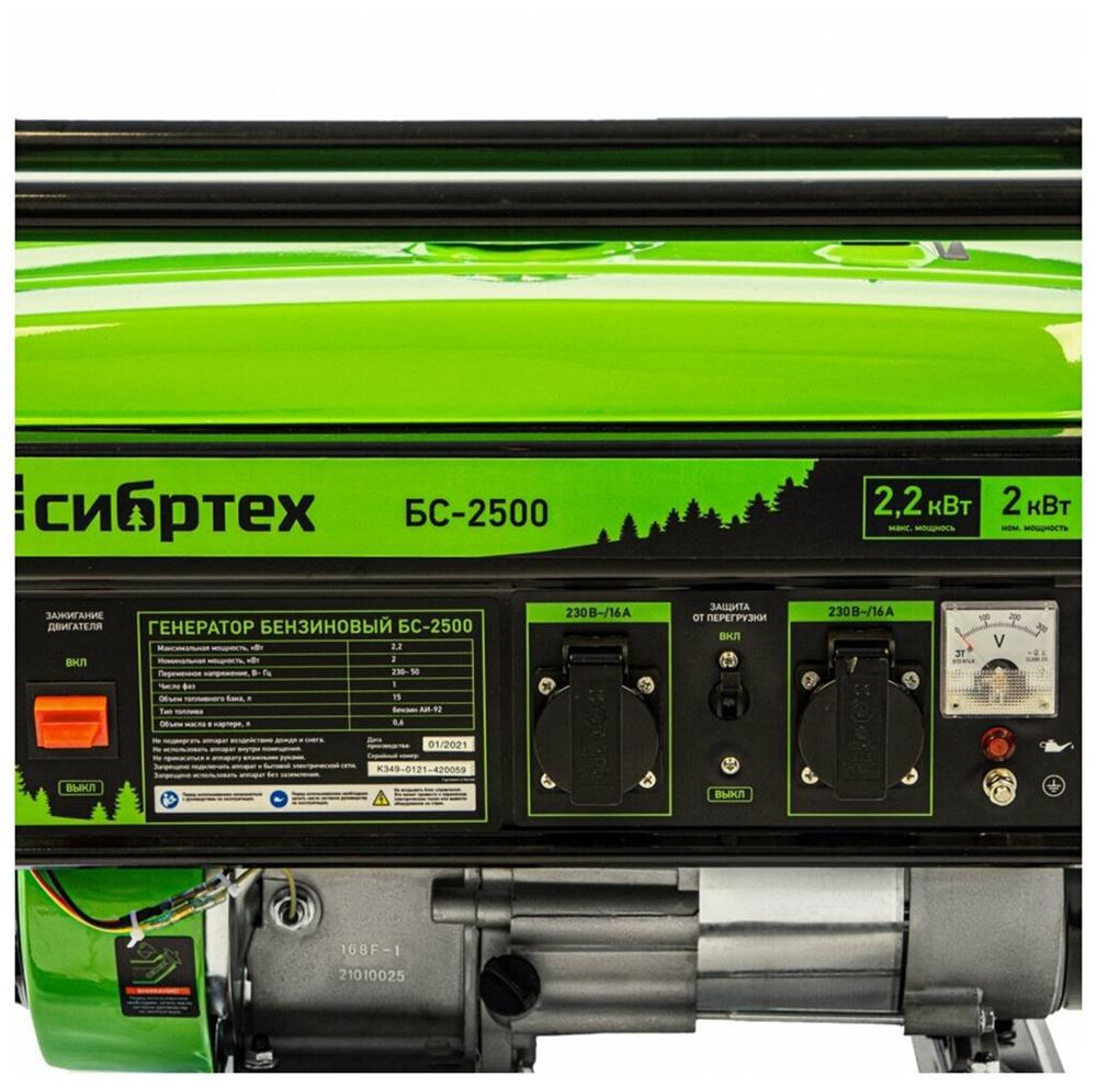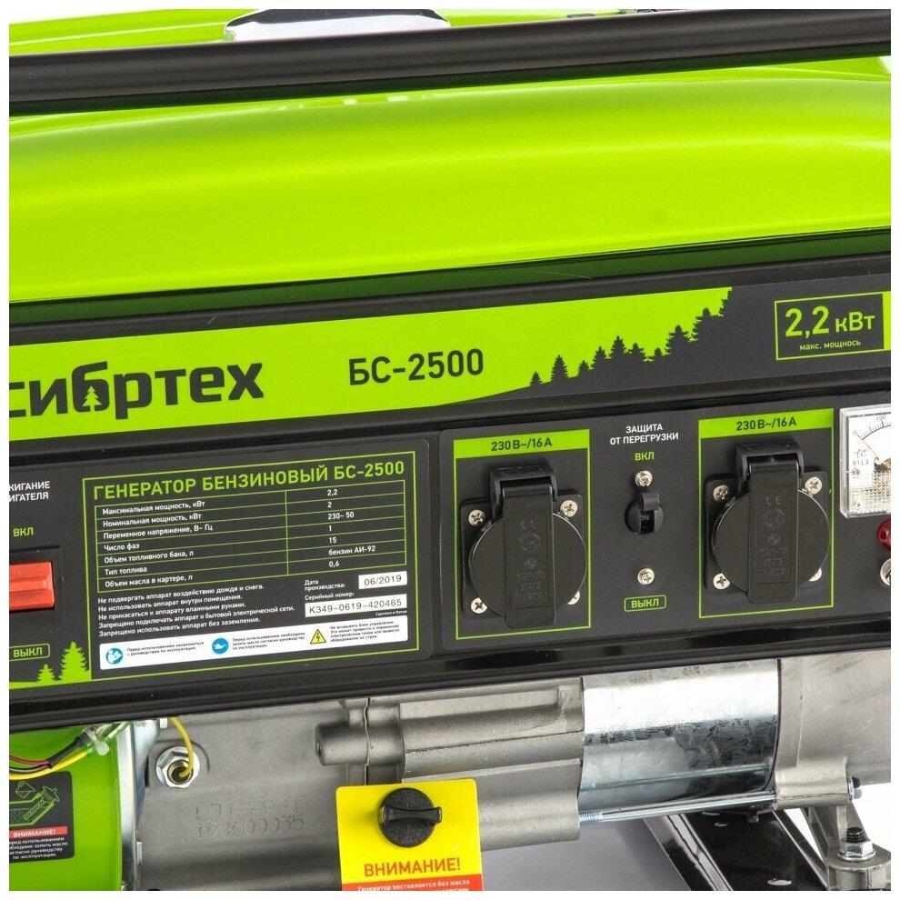СИБРТЕХ Генератор бензиновый БС-2500, 2,2 кВт, 230В, 4-х такт., 15 л, ручной стартер 94542