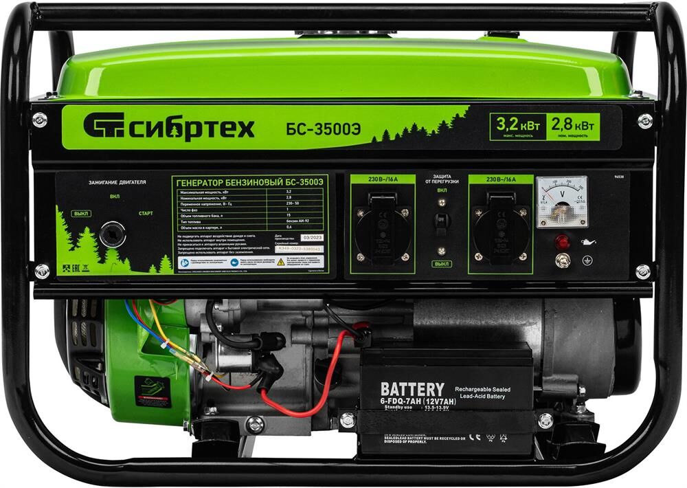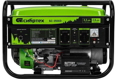 СИБРТЕХ Генератор бензиновый БС-3500Э, 3,2 кВт, 230В, 15 л, электростартер 94538