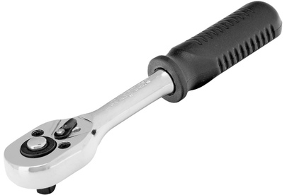 Хромированный ключ-трещотка Сибртех 14000 из стали CrV, с посадочным размером 1/4″ и 45-зубым храповым механизмом, с функцией быстрого сброса, используется для работы с резьбовым крепежом. Трещоточный механизм с 45 зубьями обеспечивает плавное вращение, облегчая работу. Инструмент пригодится дома, в мастерской и гараже. Преимущества Прочность — ключ изготовлен из закаленной хромованадиевой стали и выдерживает высокие нагрузки. Долговечность — зеркальное хромовое покрытие предотвращает образование коррозии. Эргономичность — рукоятка с нескользящей рельефной поверхностью надежно ложится в руку, поэтому работать инструментом комфортно. Функция реверса — при помощи переключателя с металлическим флажком можно одним движением изменить направление вращения трещотки. Надежная фиксация — шариковый замок крепко удерживает торцевую головку, поэтому она не соскочит во время работы. Быстрый сброс — достаточно нажать на кнопку, чтобы освободить головку от насадки, это особенно удобно для работы с крепежом разного размера.