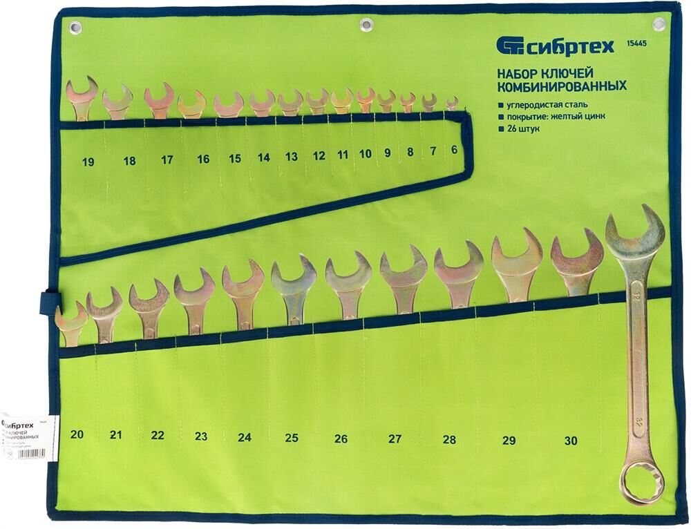 Набор комбинированных ключей Сибртех 15445 размером 6-32 мм, с покрытием «желтый цинк», включает в себя 26 инструментов для монтажа и демонтажа шестигранного резьбового крепежа соответствующего размера. Наличие рожкового и кольцевого зева делает каждый ключ универсальным в применении. Накидные головки с 12-гранным профилем надежно удерживают крепеж, уменьшая риск его деформации. Набор будет полезен в сервисном центре, авторемонтной мастерской, для выполнения монтажных работ. Пригодится также дома и на даче.ПреимуществаПрочность и устойчивость к механическим нагрузкам — ключи изготовлены из кованой углеродистой стали, прошли отжиг, закалку и последующий отпуск.Повышенная износостойкость — рабочие части закалены до твердости 45 HRC.Долговечность — желтое цинковое покрытие надежно защищает инструменты от образования коррозии.Высокая эффективность — накидные головки расположены под углом 15° к плоскости ключей, что позволяет работать с комфортом даже в труднодост