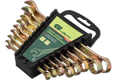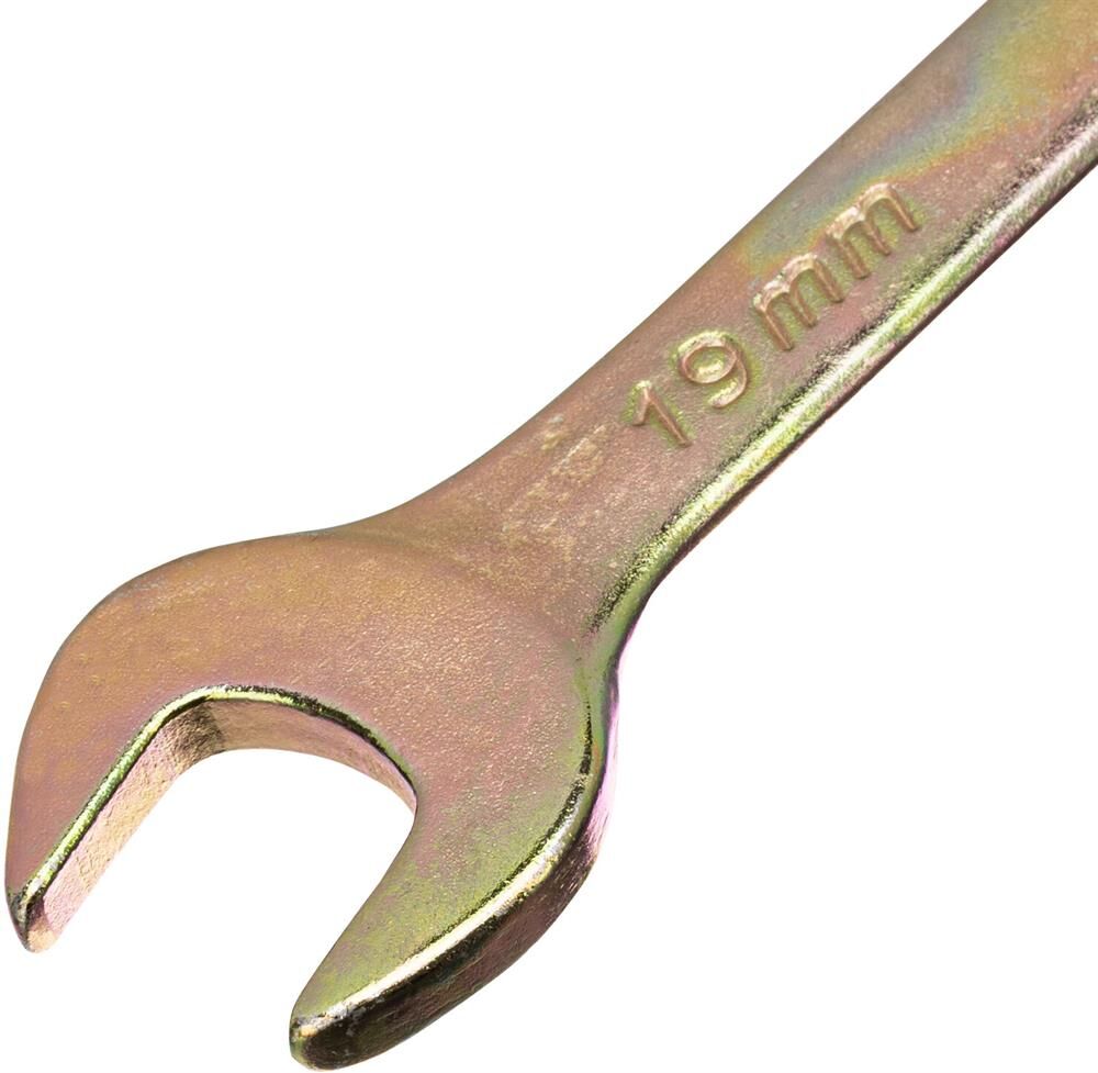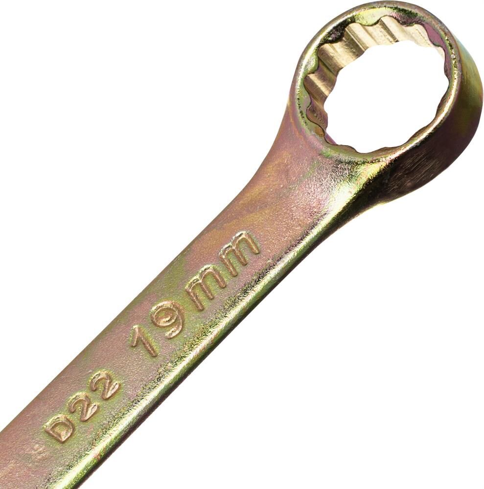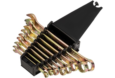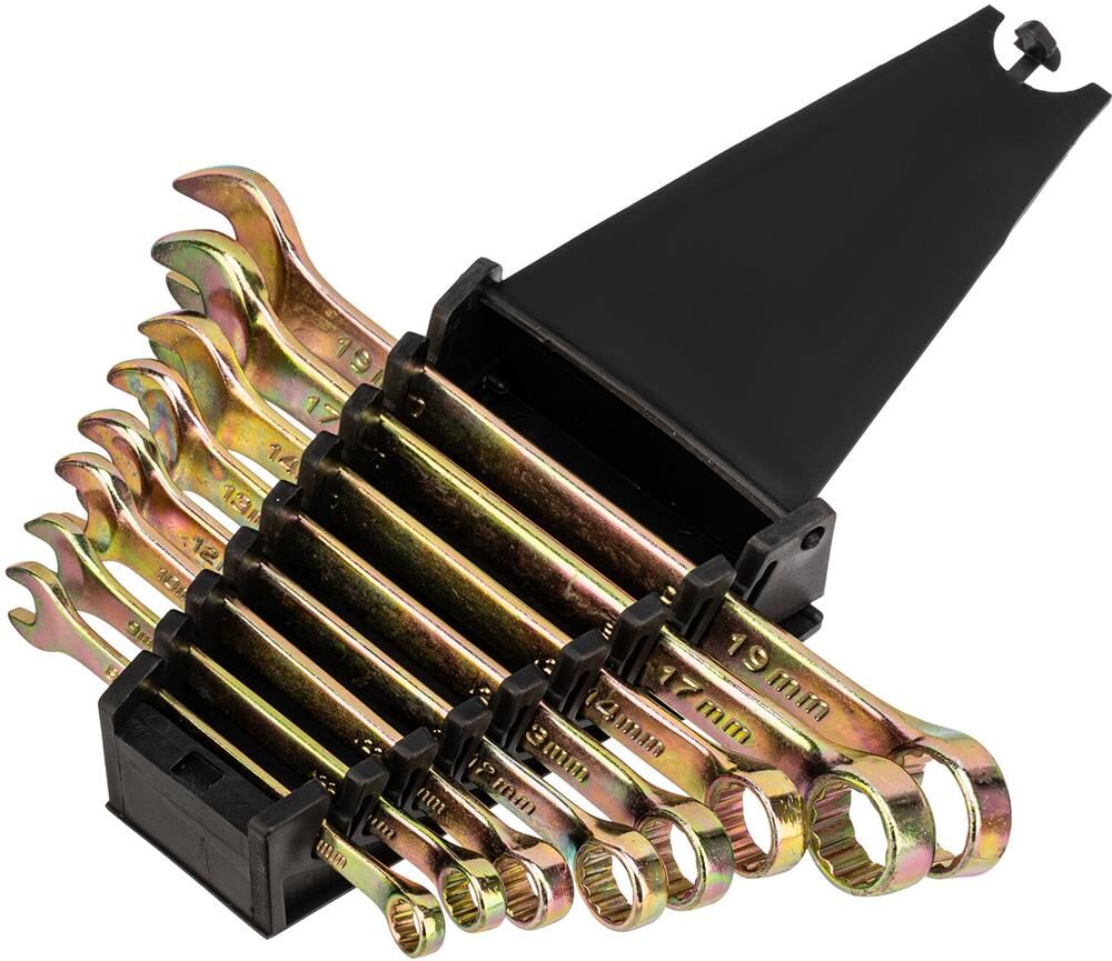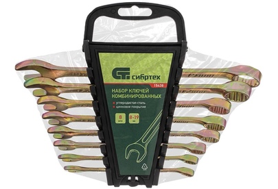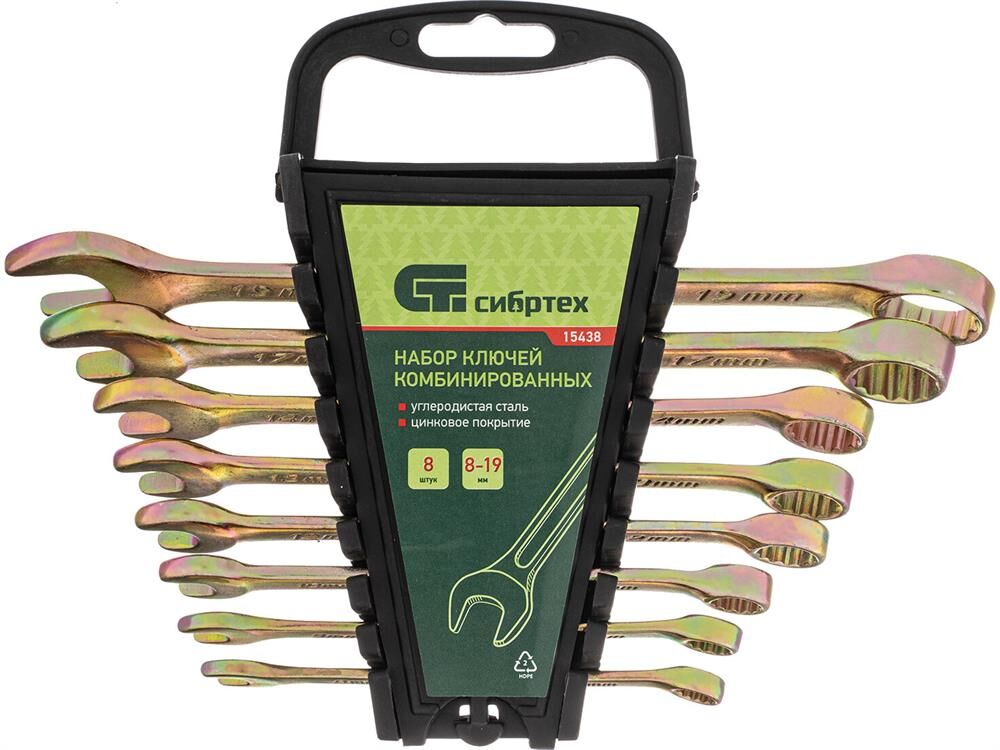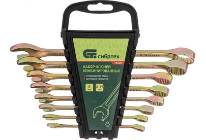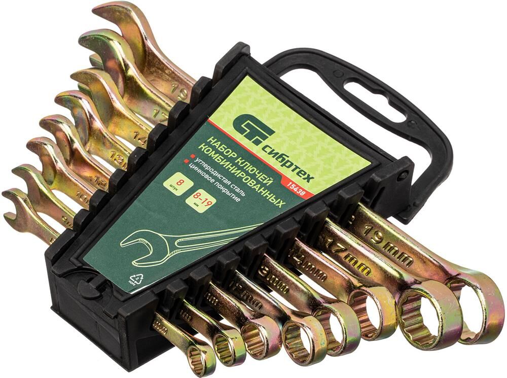 Набор комбинированных ключей 8-19мм, 8шт СИБРТЕХ 15438 состоит из прочных и качественных ручных инструментов, выполненных из углеродистой стали с коррозиестойким покрытием из желтого цинка. Ключи имеют двустороннюю конструкцию, где внутренний профиль кольцевой головки имеет 12 граней и ее угол наклона составляет 15 градусов. Комплект прост и удобен в применении, подходит для выполнения крепежных работ даже в труднодоступных местах. В процессе монтажа риск повреждения граней крепежа - минимален.