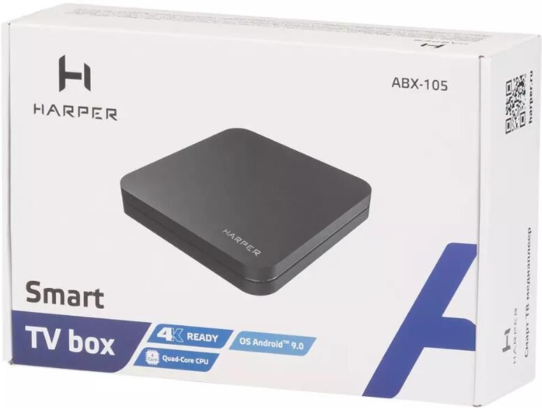 Android Box (SMART TV приставка) Harper ABX-105 – это максимально доступное, простое и компактное устройство для реализации SMART-функционала для любого телевизора (обеспечивается совместимость в том числе со старыми поколениями ТВ). Harper ABX-105 умеет работать с ультравысоким разрешением 4K (UltraHD) и актуальными технологиями динамического диапазона видео (HDR10 и HLG) поэтому картинка будет максимально чёткой и реалистичной. Подключение к сети возможно по проводному каналу (до 100 Мбит/сек) или беспроводному Wi-Fi (2,4 ГГц). Поддерживается воспроизведение всех популярных медиаформатов, предусмотрен выход для многоканального звука S/PDIF. Приставка управляется ОС Android 9.0.