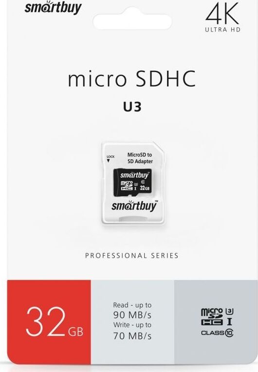 SMARTBUY (SB32GBSDCL10U3L-01) MICRO SDHC 32GB CLASS10 PRO U3 R/W: 95/60 MB/S (с адаптером SD)