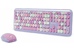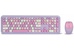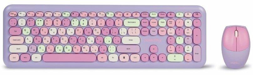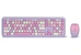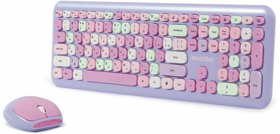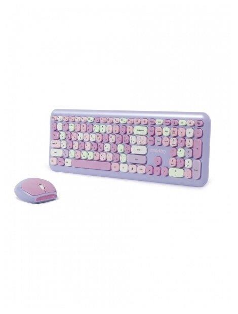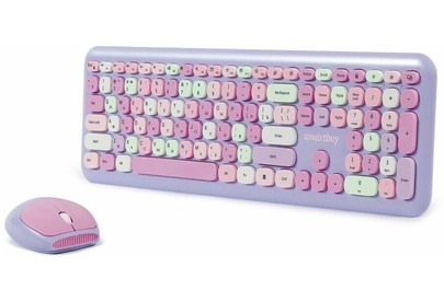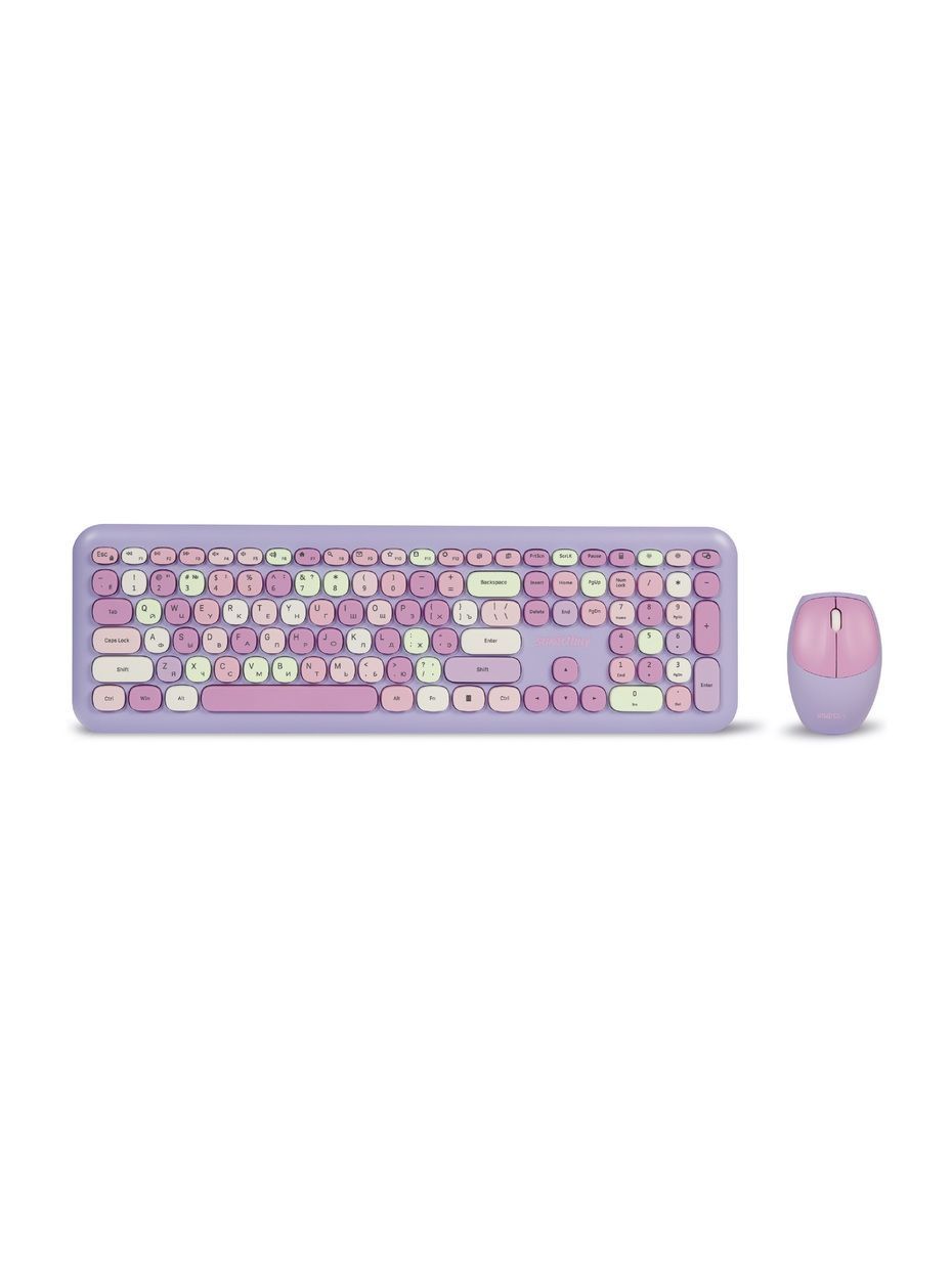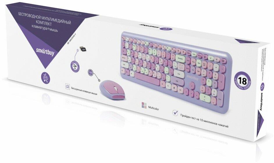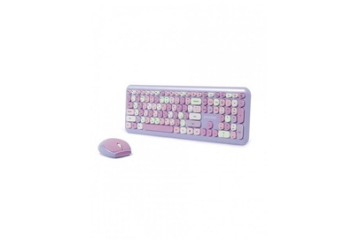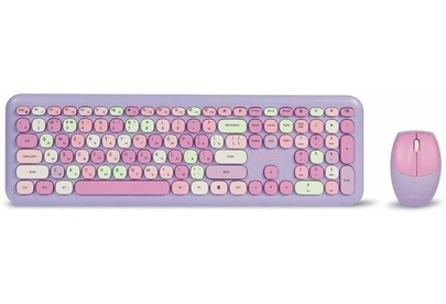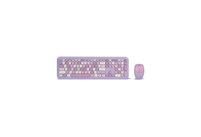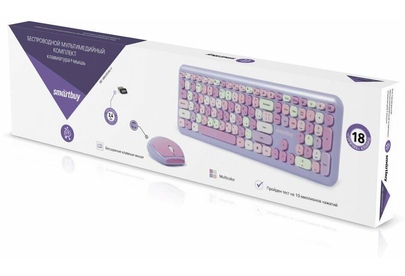 Цвет мыши: фиолетовыйТип сенсора: ОптическийКоличество кнопок мыши: 3Радиус действия: до 10 мПитание мыши: 1 батарейка ААИнтерфейс подключения: USBЦвет клавиатуры: белыйПитание клавиатуры: 1 батарейка ААА