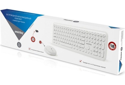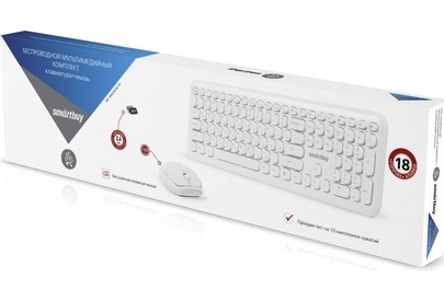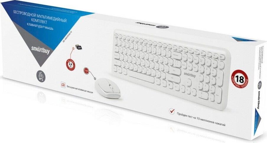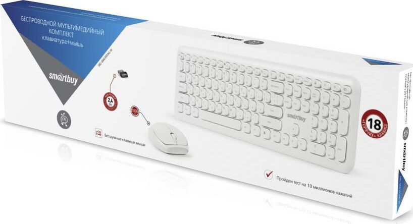 Цвет мыши: белыйТип сенсора: ОптическийКоличество кнопок мыши: 3Радиус действия: до 10 мПитание мыши: 1 батарейка ААРазрешение мыши (dpi): 1000Интерфейс подключения: USBЦвет клавиатуры: белыйПитание клавиатуры: 1 батарейка ААА
