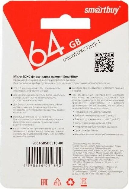 microSDXC • Объем памяти: 64ГБ • Класс скорости: Class 10 • Поддержка UHS: UHS Class 1