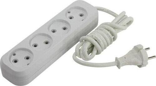 Удлинитель, количество розеток - 4, номинальный ток, А - 10, номинальное напряжение: 250 В; частота: 50 Гц; тип провода: ПВС 2x1,0мм2; материал корпуса: АБС-пластик; климатическое исполнение: УХЛ-3; степень защиты от влаги и пыли: IP-20; длина провода - 2 м.
