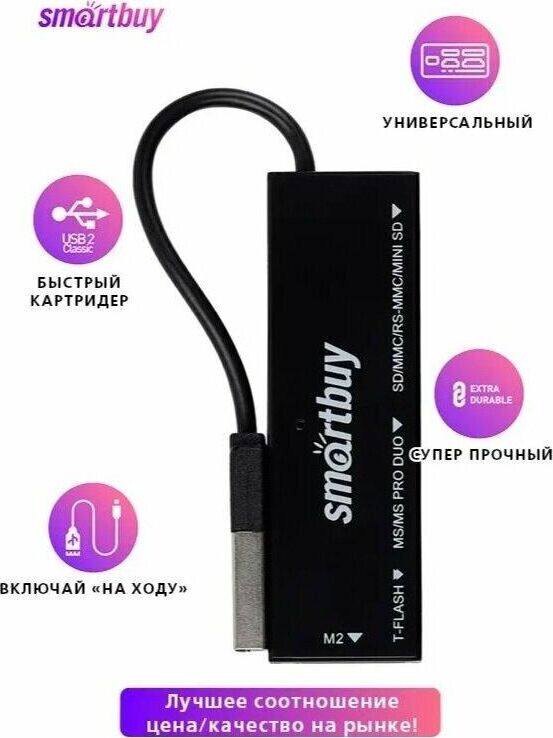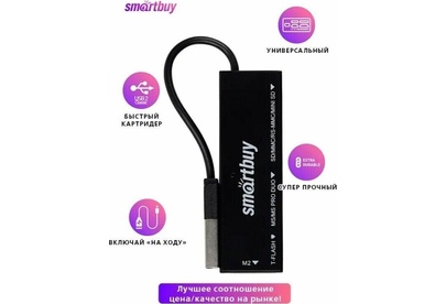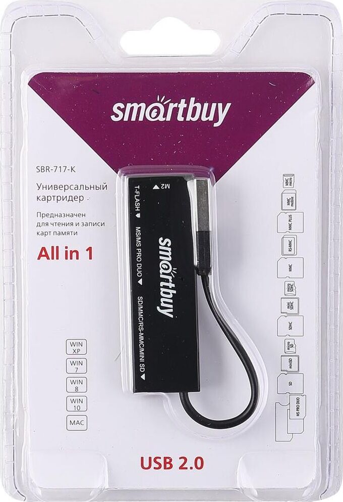 Мультиформатный картридер.Питание от USB порта.Скорость передачи данных до 480 Мбит/сек.Поддержка режима Plug-n-Play, не требует установки дополнительного драйвера.