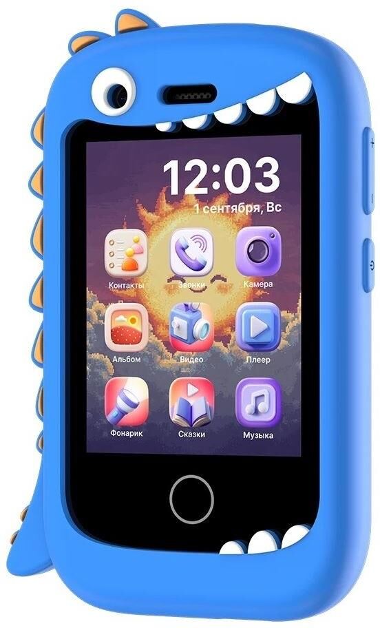 Недорогой, легкий детский игровой «смартфон» с защитным сменным чехлом, который безопасно займет ребенка 3+, развивая его. Первый свой собственный гаджет! 2 камеры с возможностью наложения забавных фильтров 50+ аудиосказок в исполнении лучших артистов РФ 10 иллюстрированных аудиосказок на английском языке Большой выбор обучающий и развлекательных игр Фонарик, будильник, календарь, калькулятор, диктофон и т.д. 4 ГБ памяти для фото и музыки NanoSIM и 10 «белых» номеров Работа в 2G сети 900/1800 Без выхода в интернет В комплекте защитный силиконовый чехол с динозавриком