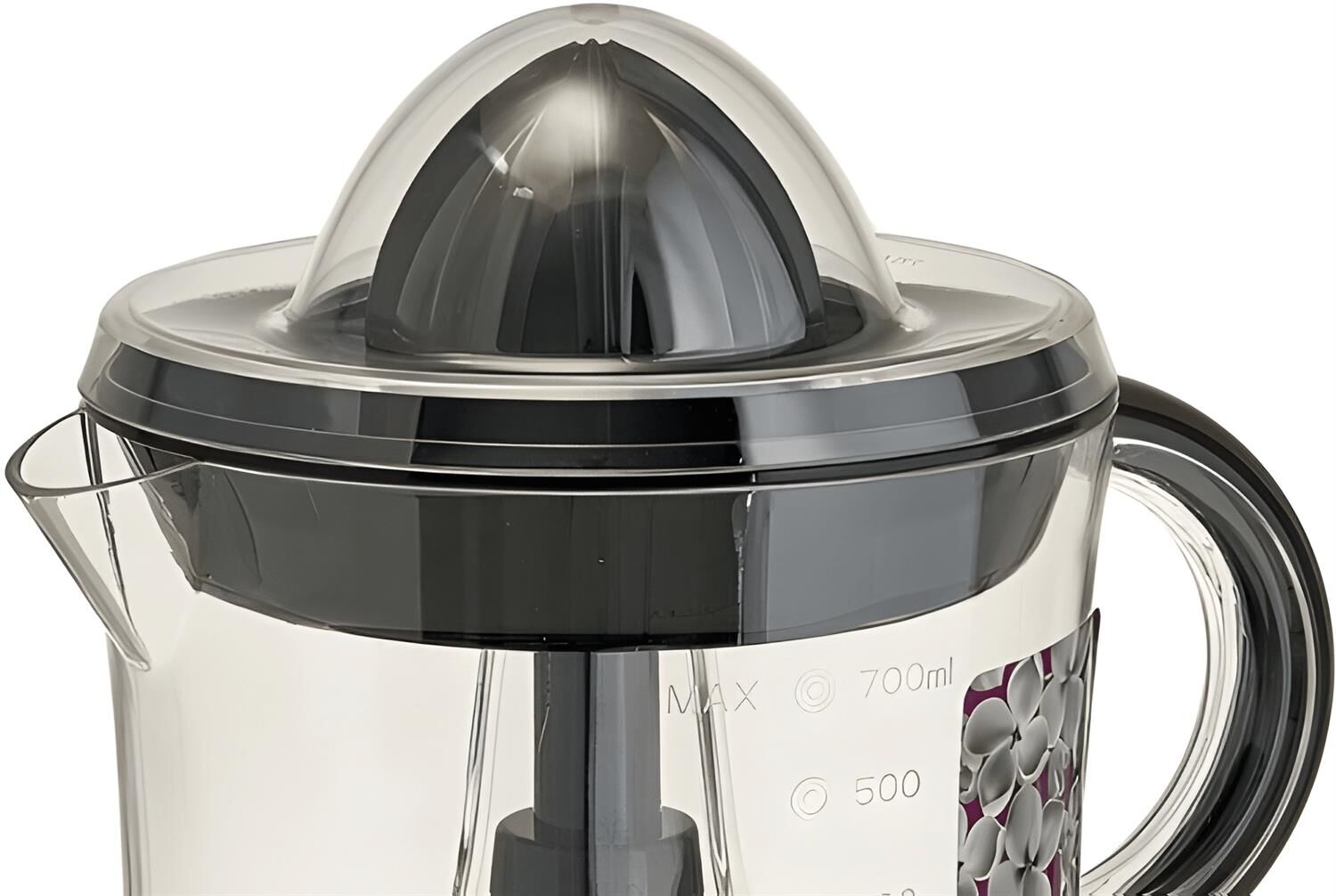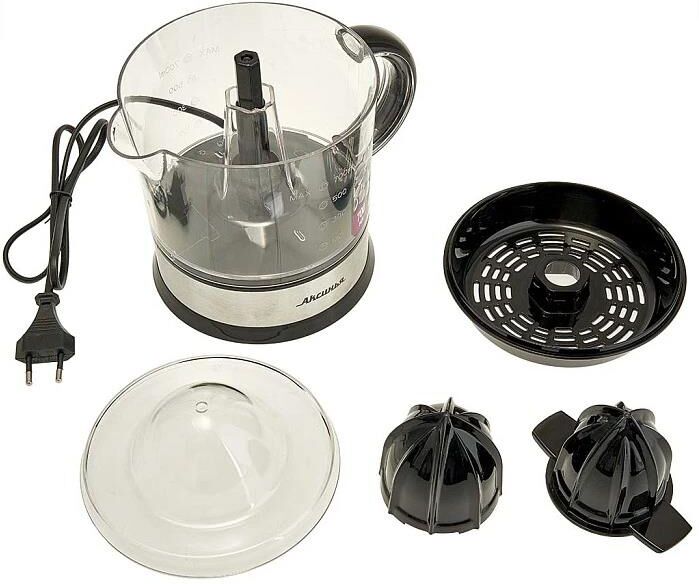 Номинальная потребляемая мощность 40 Вт Емкость чаши 700 мл Описание Соковыжималка электрическая предназначена для извлечения сока из лимона, лайма, апельсина и грейпфрута в бытовых и аналогичных условиях Корпус из пластика Цвет: черный Прозрачная чаша с мерной шкалой Прозрачная крышка Две конусовидные насадки разных размеров Противоскользящие резиновые ножки Односкоростной режим работы Вращение в обе стороны Возможность мытья чаши в посудомоечной машине