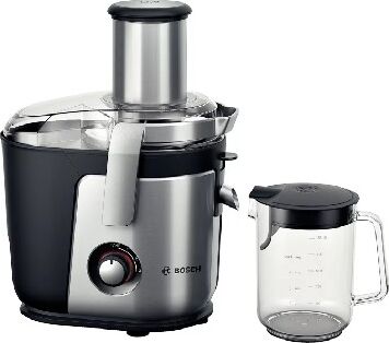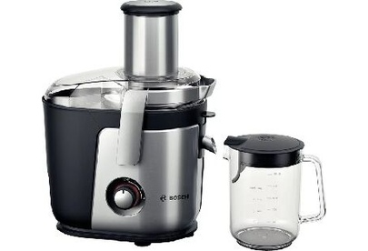 BOSCH MES4010 центробежная соковыжималка мощность 1200 Вт стакан для сока в комплекте подача сока сразу в стакан противокапельная система автоматический выброс мякоти отсекатель пены сока алюминиевый корпус возможность загрузки целых плодов