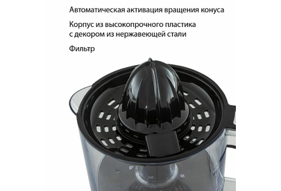 Соковыжималка для цитрусовых, Объем 0,8 л., Мощность 30 Вт., 2 сменные насадки-конуса для фруктов разного размера, Прозрачная крышка для защиты от пыли, Прорезиненные ножки, Пластиковый корпус с декором из нержавеющей стали, Легко разбирать и мыть