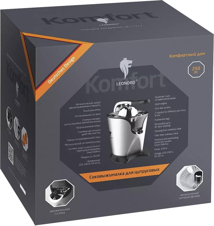 Автоматический запуск двухнаправленного поворота Тихий двигатель Антикапельная система Прорезиненные ножки Съемные детали для удобства очистки 2 конуса-насадки для цитрусовых разной величины Корпус из нержавеющнй стали Металлический сетчатый фильтр Система защиты двигателя от перегрузки/перегрева Smart Defense Мощность 250 Вт Напряжение 220-240В, 50-60Гц 2 года гарантии Длина шнура 1,2 м