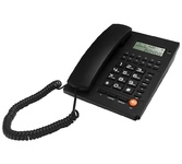 Проводной телефон с дисплеем. Сброс / Пауза/ Повторный набор. ЖК дисплей, 5 уровней контрастности. Регулировка громкости звонка. Хендс-фри, спикерфон. Переключение Импульсного /Тонового набора номера. FSKD/DTMF системы определения номера входящего звонка (Caller ID). 35 входящих, 10 исходящих номеров в памяти - номер, дата и время доступны для просмотра, 16 мелодий звонка, 10 однокнопочных набора. Календарь и часы в реальном времени на дисплее. Набор до дозвона с функцией корректировки. Функция «любимого номера». Поддержка функции Power Safe