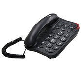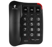 Проводной телефон, индикатор вызова, однокнопочный набор, 3 номера, 4 уровня громкости звонка, возможность установки на стене, черный.