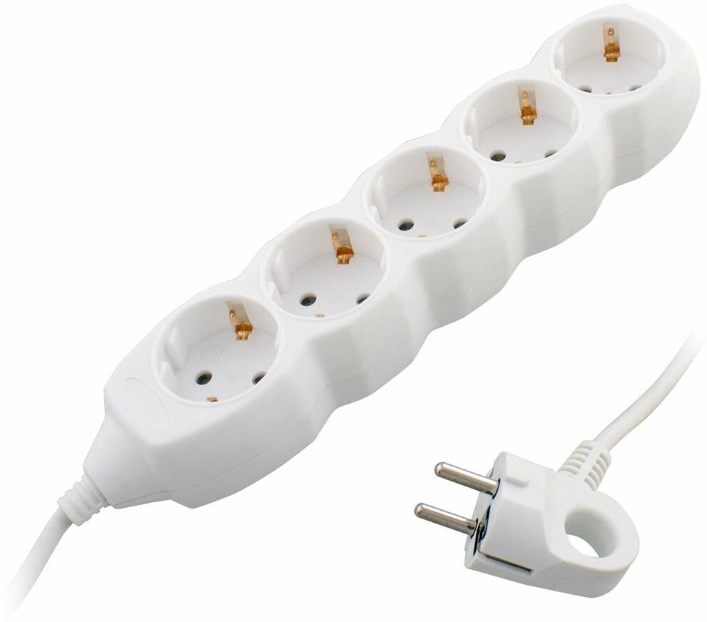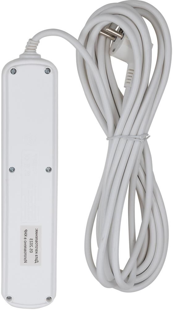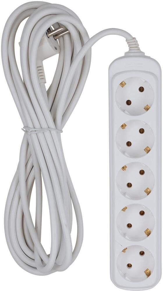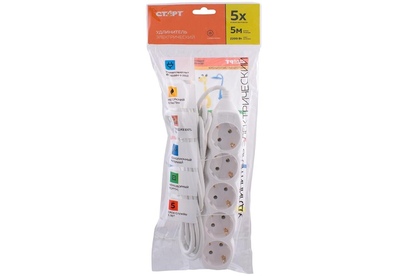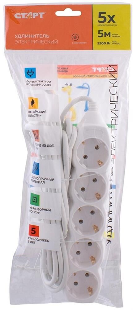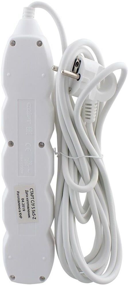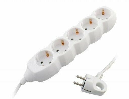 Колодка на 5 розеток Длина провода 5 м. Провод ПВС с сечением 3х0,75 мм2. Заземление Макс нагрузка 2200 Вт Сила тока 10 А Эргономичная вилка Материал - негорючий, ударопрочный РР-пластик. Корпус неразборный. Цвет-белый