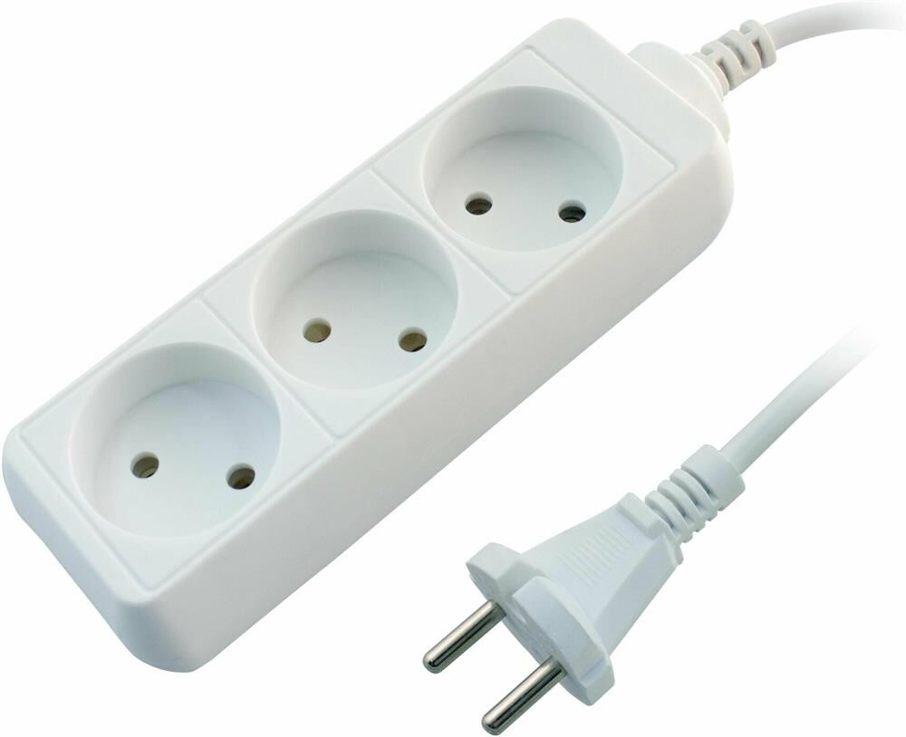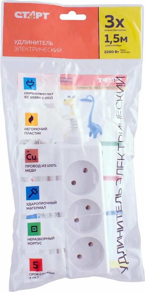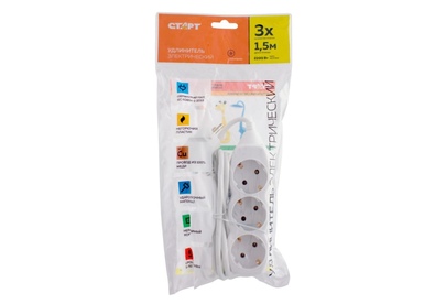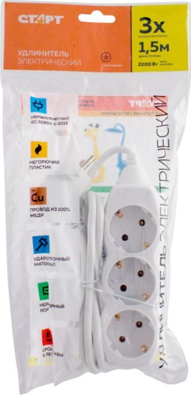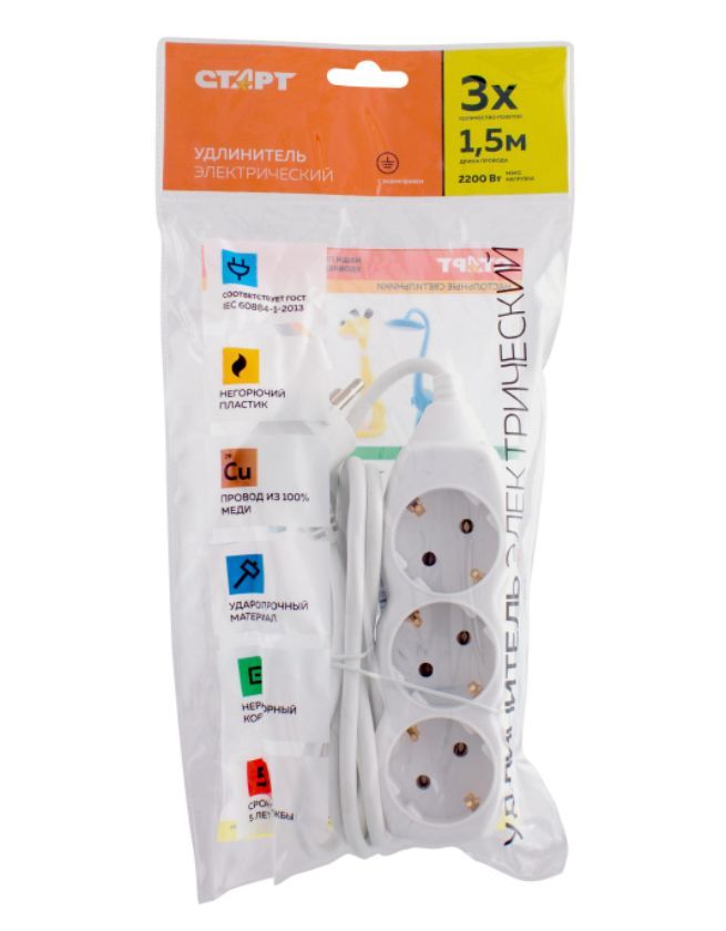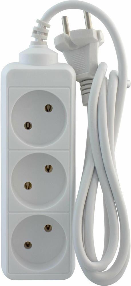 Колодка на 3 розетки Длина провода 1,5 м. Провод ПВС с сечением 3х0,75 мм2. Заземление Макс нагрузка 2200 Вт Сила тока 10 А Эргономичная вилка Материал - негорючий, ударопрочный РР-пластик. Корпус неразборный. Цвет-белый
