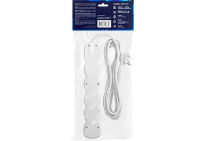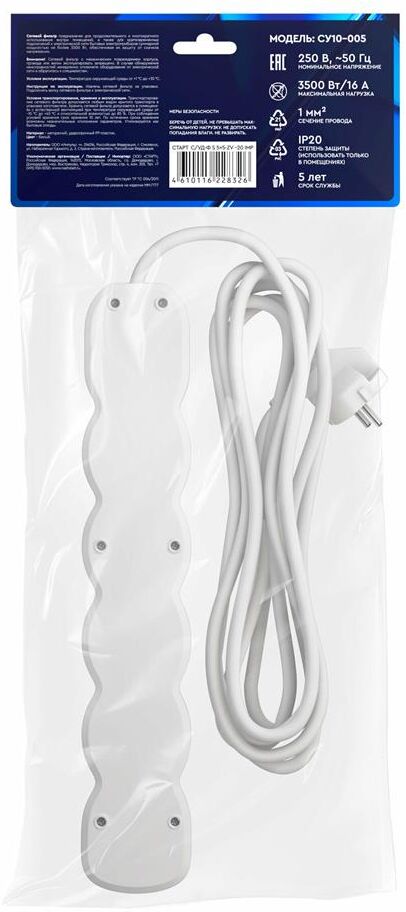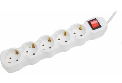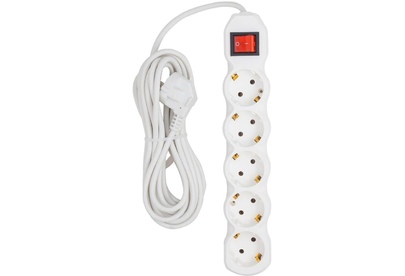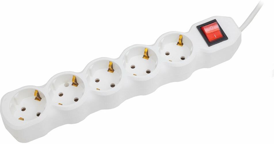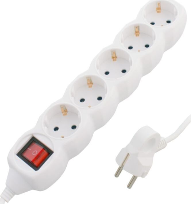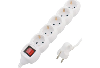 Колодка на 5 розеток Длина провода 5 м. Провод ПВС с сечением 3х0,75 мм2. Заземление Кнопка включения Макс нагрузка 2200 Вт Сила тока 10 А Эргономичная вилка Материал - негорючий, ударопрочный РР-пластик. Корпус неразборный. Цвет-белый