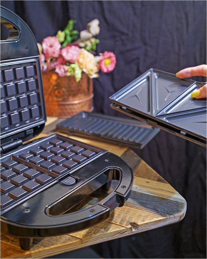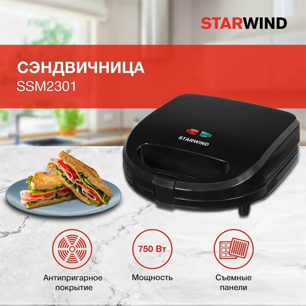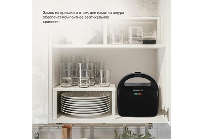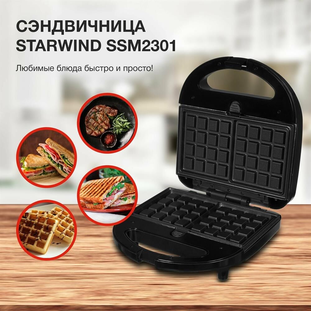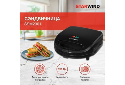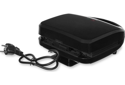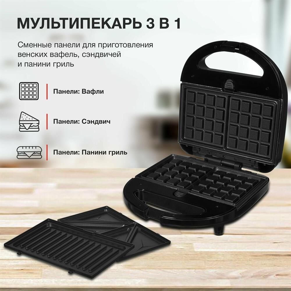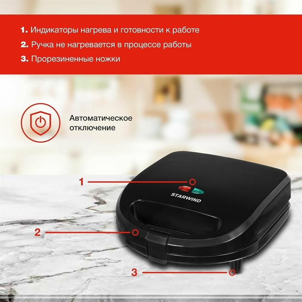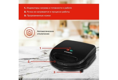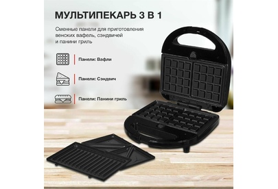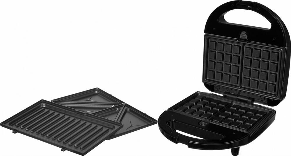 Мощность 750 Вт Съемные формы : пластины для вафель, сэндвичей, гриля 4 отделения для бутербродов 2 отделения для вафель Индикатор нагрева Автоматическое отключение (защитное) Замок фиксации закрытия крышки Цвет черный Срок гарантии 12 мес Ненагревающаяся ручка