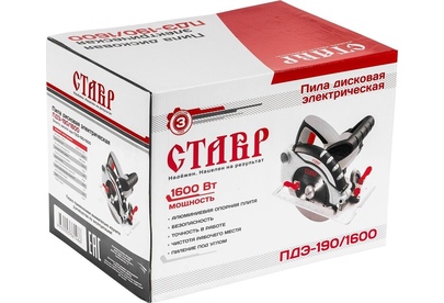 СТАВР ПДЭ-190/1600 Пила дисковая электрическая СТАВР ПДЭ-190/1600 Мощность 1600 Вт, 5000 об/мин. Диаметр диска 190 мм., посадочный диаметр диска 20 мм. Угол пропила до 45 градусов. Максимальная глубина пропила до 63 мм. Длина сетевого кабеля 2 м.