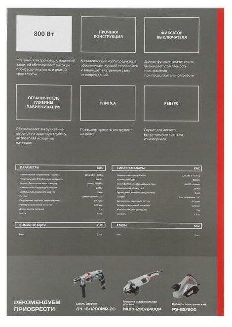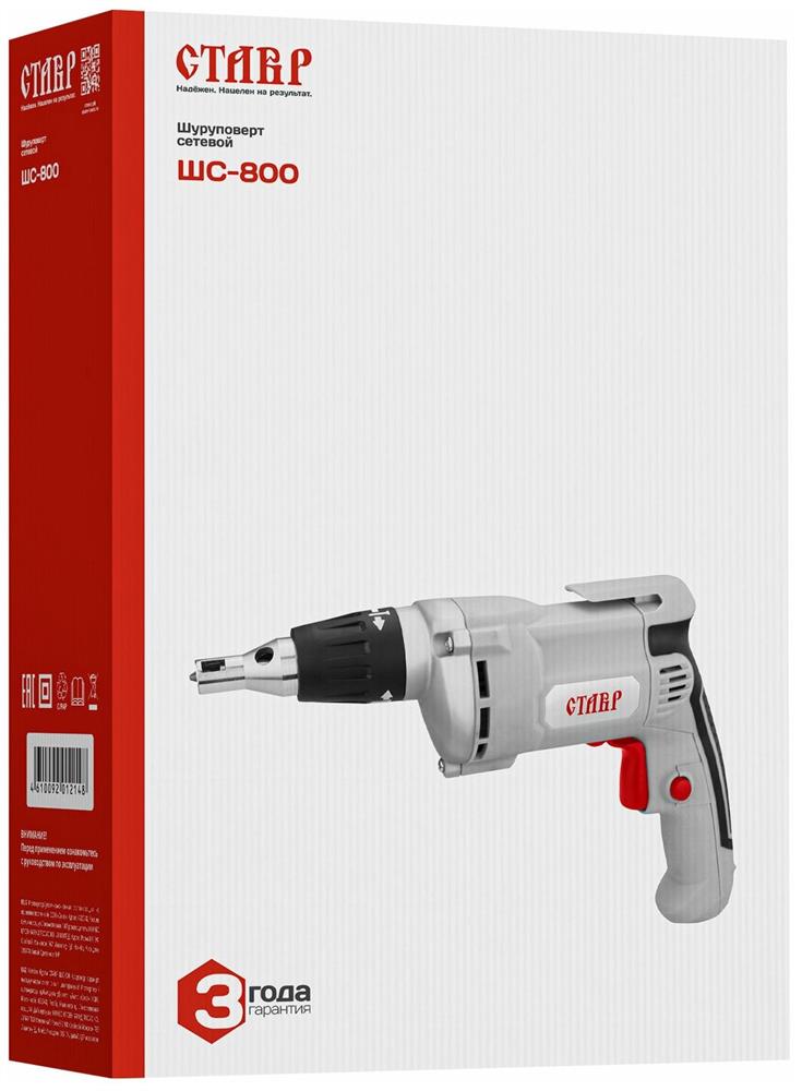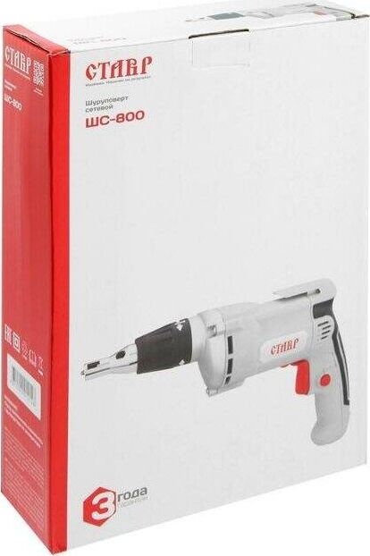 Потребляемая мощность, Вт 800. Напряжение сети / Частота, В/Гц 220В±10% / 50Гц. Число оборотов на холостом ходу, об/мин 0-4000. Максимальный крутящий момент, Нм 28. Регулировка глубины завинчивания 0-13 мм. Максимальный диаметр самореза, мм 8. Диаметр зажима, мм 6,35. Длина сетевого кабеля, м 3. Гарантийный срок 3 года. Габаритные размеры, мм 300х190х72. Масса, кг 1,5. Комплект поставки бита 2 шт.