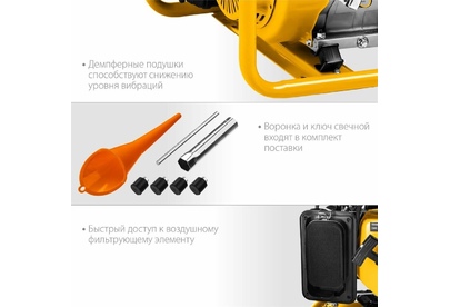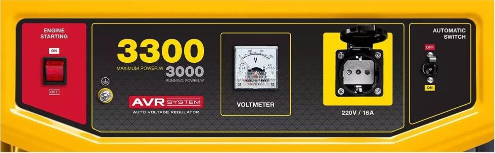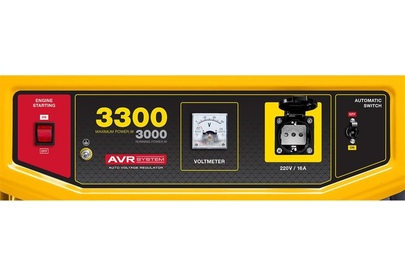 Max мощность, кВт: 3.3. Вид топлива: бензин Аи92. Выход 12V: нет. Датчик масла: есть. Евро разъём Schuko 230V/16А: нет. Индикатор уровня топлива: есть. Контроль напряжения: AVR. Тип двигателя: 4-х тактный. Тип электростанции: мобильные. Уровень шума, дБ: 72. Эл. выходы 380/220/12, шт: -/1/-. Мощность номинальная при 220 В, кВт: 3. Напряжение, В: 220. Стартер: ручной. Альтернатор: синхронный. Автозапуск (АВР): нет. Емкость топливного бака, л: 15. Вес, кг: 47.