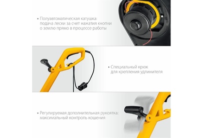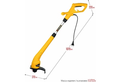 Мощность, Вт 400. Частота вращения шпинделя, об/мин 11500. Режущий элемент леска. Ширина скашивания (леска), см 25. Ширина скашивания (нож), см -. Толщина лески, мм 1.2. Тип катушки полуавтоматическая. Тип рукоятки T-образная. Тип штанги телескопическая. Ремень нет. Напряжение питания, В/Гц 230 / 50. Габариты, см 51x20x13. Масса изделия, кг 2. Масса в упаковке, кг 2.6.